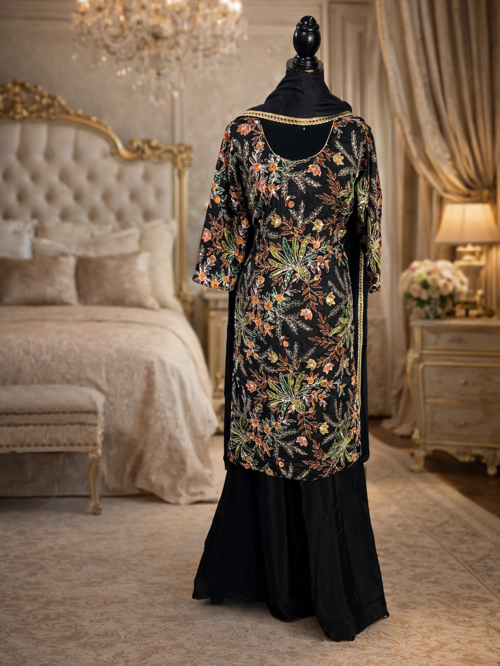 Experience elegance with the Black Fabric palazzo suit Code 44 from Mannat Boutique, expertly crafted for the discerning wearer of Indian outfits. This ensemble features a crape fabric handwork shirt paired with a Palin crape sharara, creating a sophisticated silhouette. The pure chinon dupattas with lining add a graceful touch, enhanced by refined piping, a discreet zipper for comfort, and a delicate latkan in the back. Designed to deliver both style and comfort, this suit reflects Mannat Boutique’s commitment to quality and traditional craftsmanship. Elevate your wardrobe with this timeless piece that perfectly blends artisanal detail with contemporary charm.