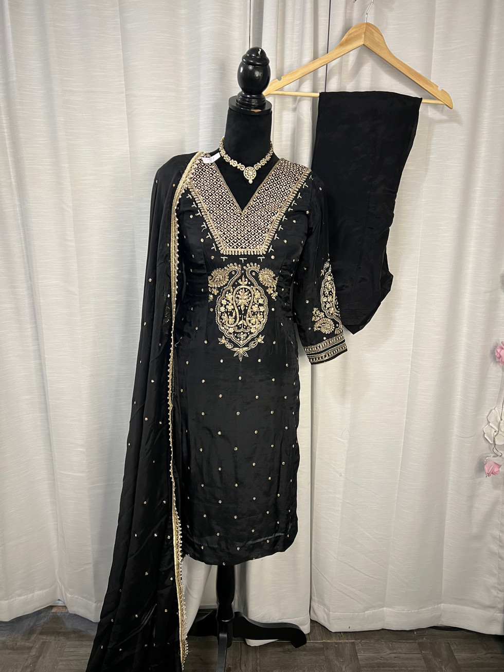Introducing the exquisite Black Handwork Salwar Suit Code 34B, exclusively available at Mannat Boutique. Crafted from luxurious crape fabric, this fully stitched ensemble features delicate pure chinon small boti handwork complemented by an elegant golden lace. Designed with utmost care, it includes a lining, piping, zipper, and latkan for a perfect fit and finish. Elevate your traditional wardrobe with this stunning piece that marries timeless elegance with intricate craftsmanship. Experience the true essence of Indian outfits with Mannat Boutique.