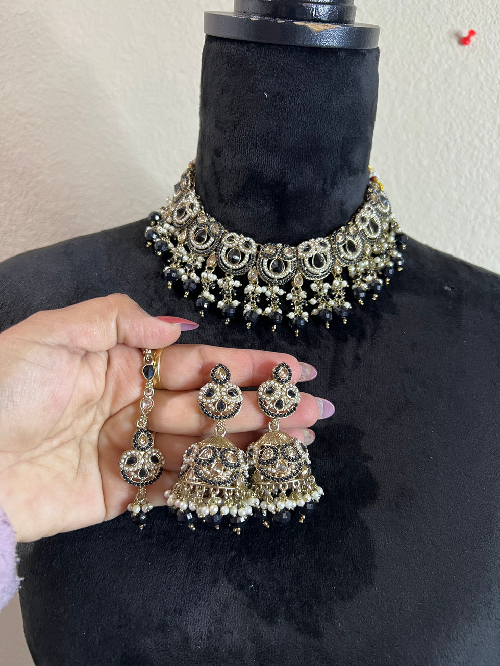 Indulge in the timeless elegance of our high quality Black Polki Kundan Set with beautiful pearls. This exquisite piece from Mannat Boutique is complemented by a pair of stunning jhumki and a matching tikka, perfect for elevating any traditional Indian outfit. Crafted with precision, this set reflects our commitment to providing sophisticated and authentic designs. Ideal for special occasions, it effortlessly combines luxury with cultural heritage. Transform your look and make a statement with this captivating ensemble from Mannat Boutique.