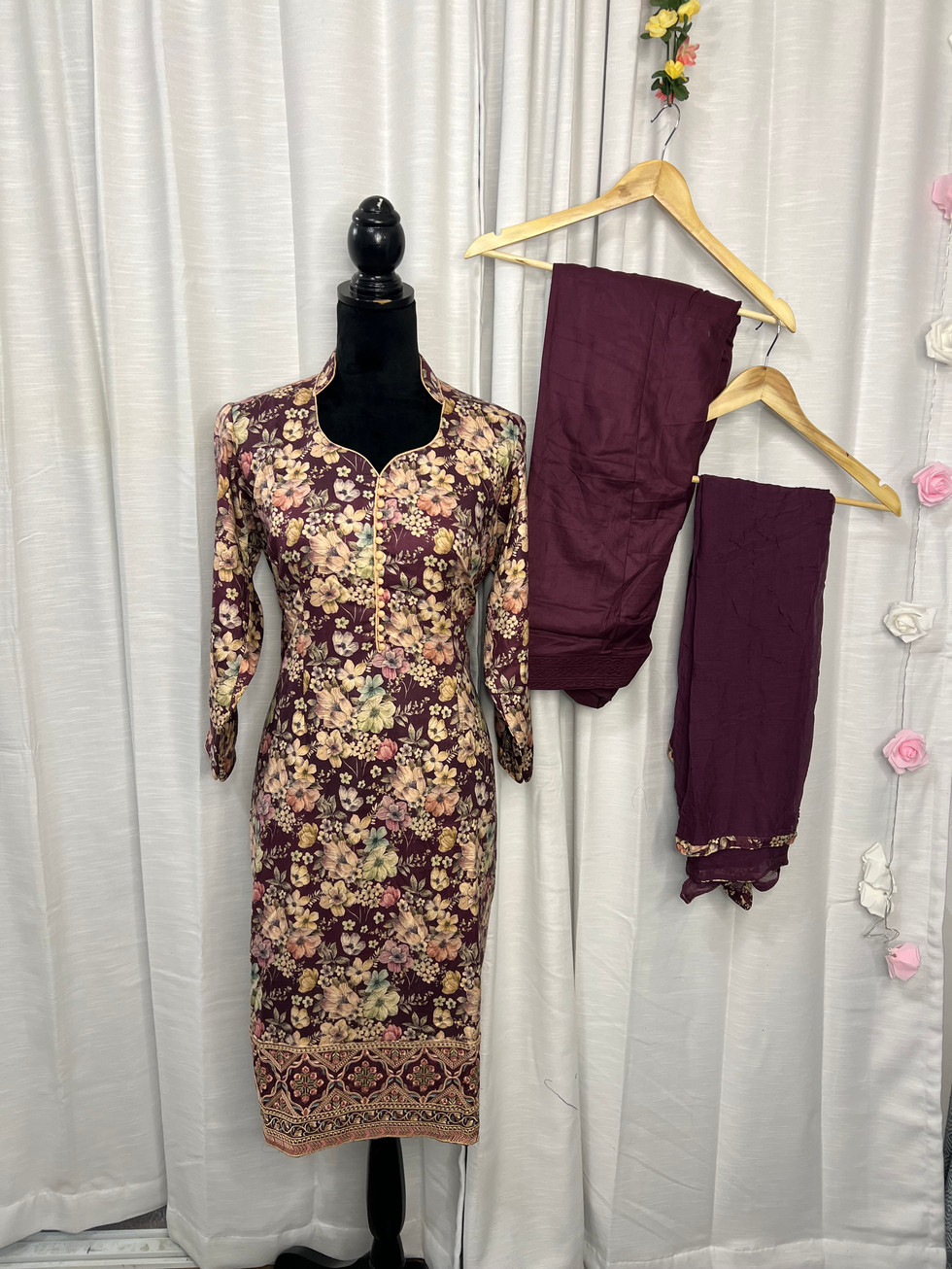Indulge in luxury with the Cotrise Salwar Suit Code 46C from Mannat Boutique. This exquisite ensemble features a pure velvet print salwar suit paired with a delicate pure chinon dupatta, ensuring you stand out at any event. The fully stitched suit, complete with lining, piping, and a convenient zipper, offers both elegance and comfort. Trust in Mannat Boutique’s commitment to quality and style with this meticulously crafted outfit.