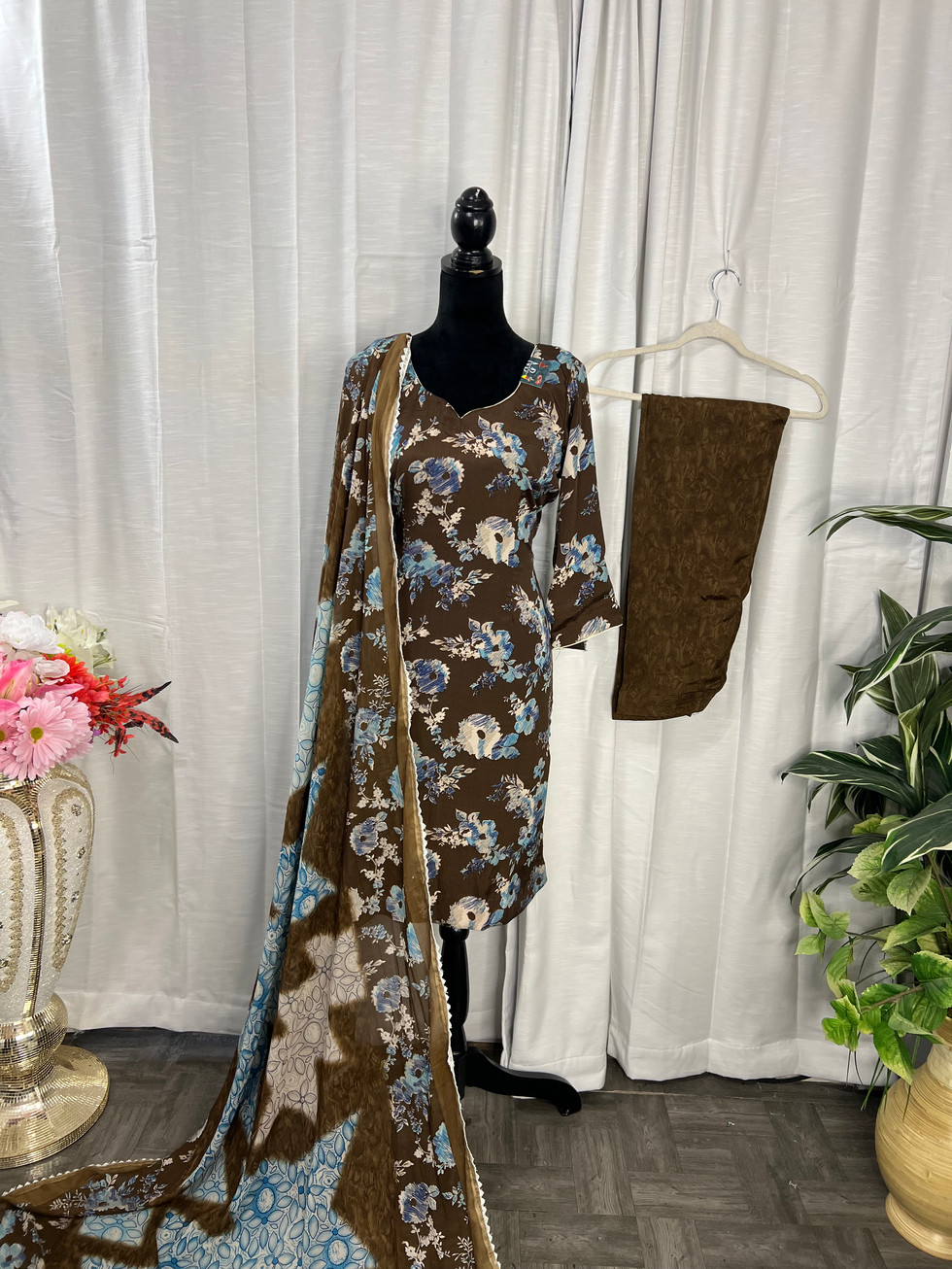 Experience elegance and comfort with our Crape Fabric Print Suit Code 042C from Mannat Boutique. This exquisite Indian outfit features a pure carpe fabric print salwar suit paired with a beautifully printed dupatta adorned with delicate lace. The fully stitched suit ensures hassle-free wear with its premium lining, intricate piping, reliable zipper, and traditional dori detailing. Our commitment to quality guarantees you receive a piece that embodies both style and craftsmanship. Perfect for any occasion, feel confident and stylish in this timeless ensemble.