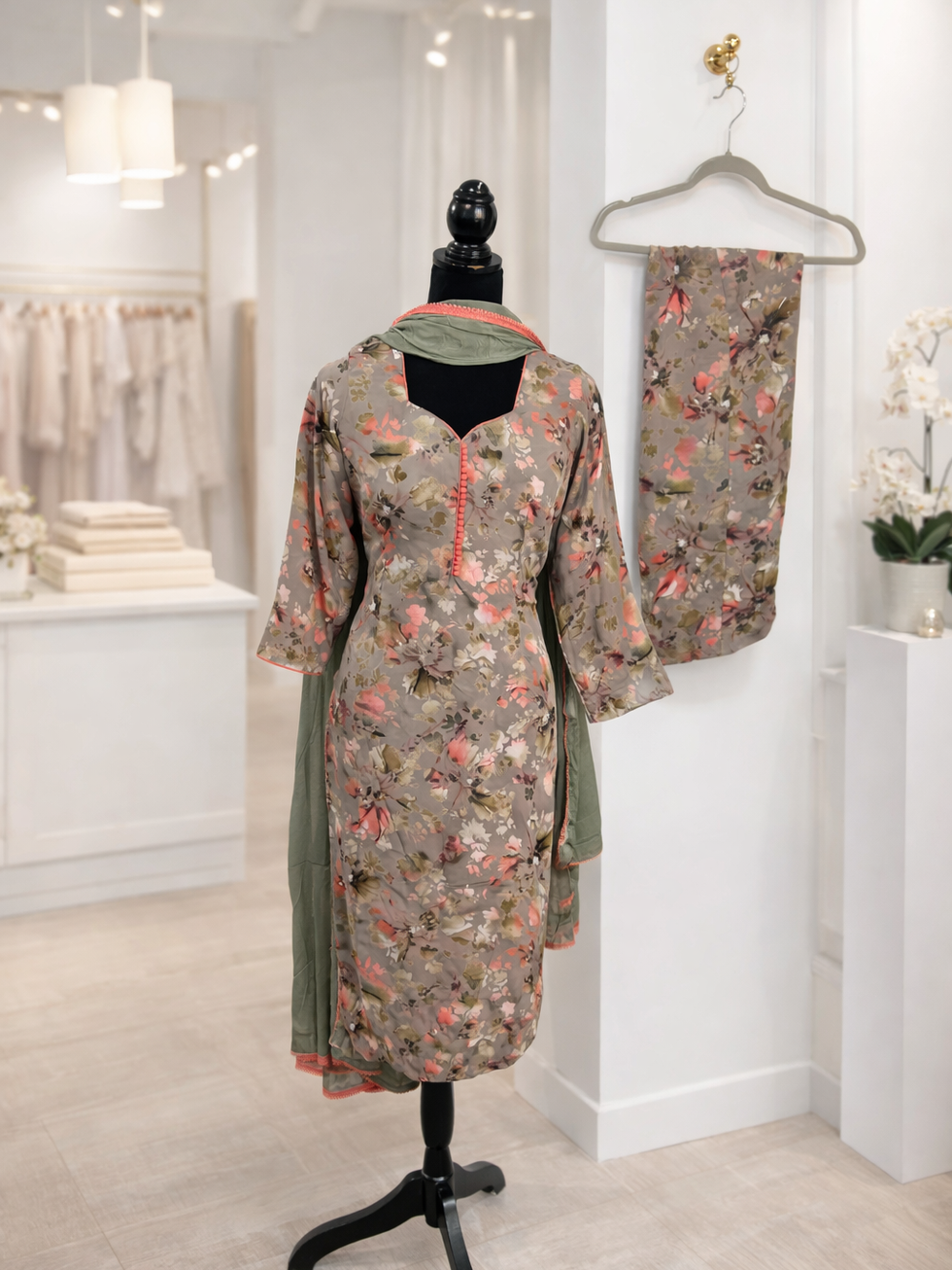 Experience elegance with the Crape Print Salwar Suit Code 44 from Mannat Boutique, crafted from premium crape fabric featuring intricate prints. This fully stitched suit offers comfort and style with its lining, precise piping, and a convenient zipper and dori in the back for a perfect fit. Complemented by a pure chinon dupatta adorned with delicate lace, this ensemble embodies traditional charm with modern tailoring. Designed for discerning customers, Mannat Boutique ensures each outfit reflects quality and sophistication, perfect for any occasion. Elevate your ethnic wardrobe with this graceful and durable salwar suit.