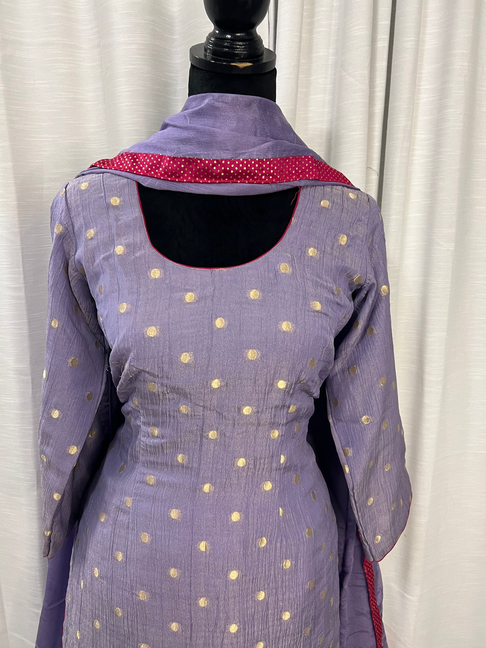 Discover the elegance of the Crush Shimmer Banarsi Dots Sharara Suit at Mannat Boutique, crafted to perfection with a fully stitched design featuring lining, piping, zipper, and proper contrast pasting for a flawless fit. Complemented by a pure chinon dupatta adorned with delicate pasting lace, this ensemble exemplifies traditional charm with contemporary finesse. Ideal for those seeking a blend of comfort and style, the suit ensures durability and grace for any festive occasion. At Mannat Boutique, we prioritize quality and craftsmanship to deliver authentic Indian outfits that celebrate your unique style. Elevate your wardrobe with this exquisite sharara suit, designed for the discerning wearer.