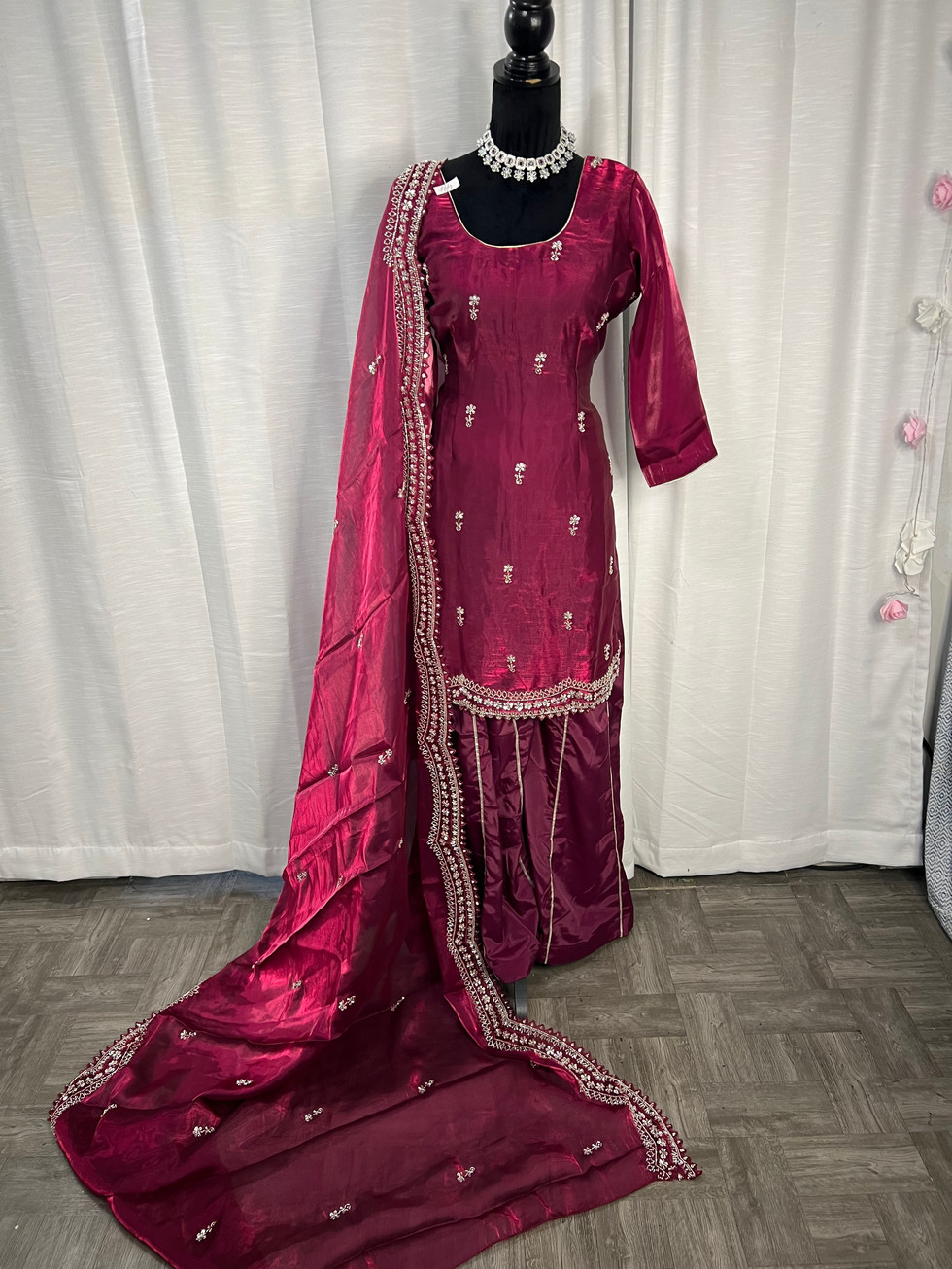 Discover the elegance of our Fandy Silk Handwork Palazo Suit Code44 at Mannat Boutique. This exquisite semi fandy silk handwork palazo suit comes with a matching duppatta, also crafted from fandy silk and detailed with intricate handwork. The fully stitched suit ensures a flawless fit with its lining, piping, zipper, and charming latkan. Ideal for any festive occasion, this suit combines tradition with contemporary style, embodying the values of quality and sophistication that Mannat Boutique stands for. Enhance your wardrobe with this luxurious outfit and make a lasting impression.