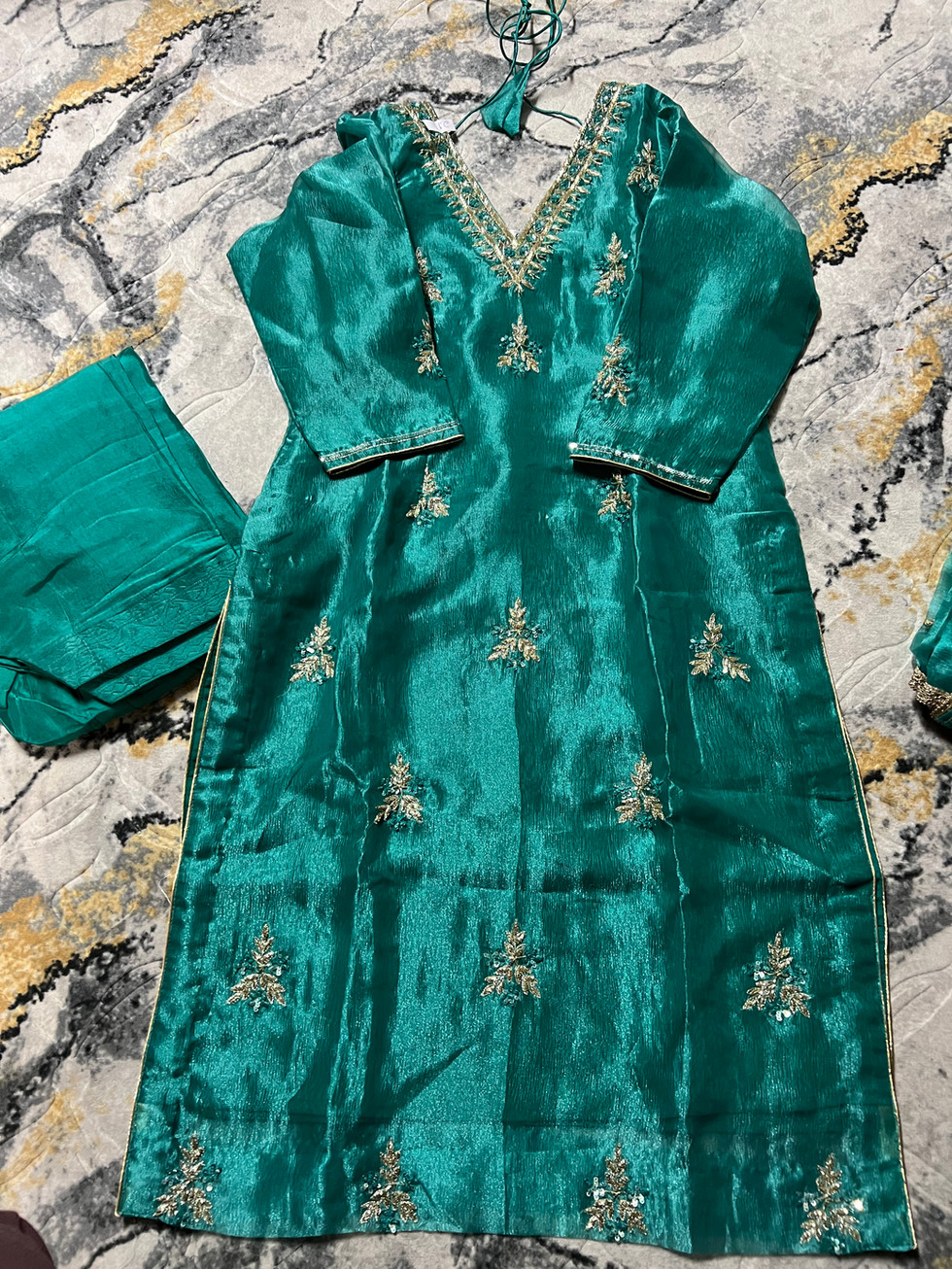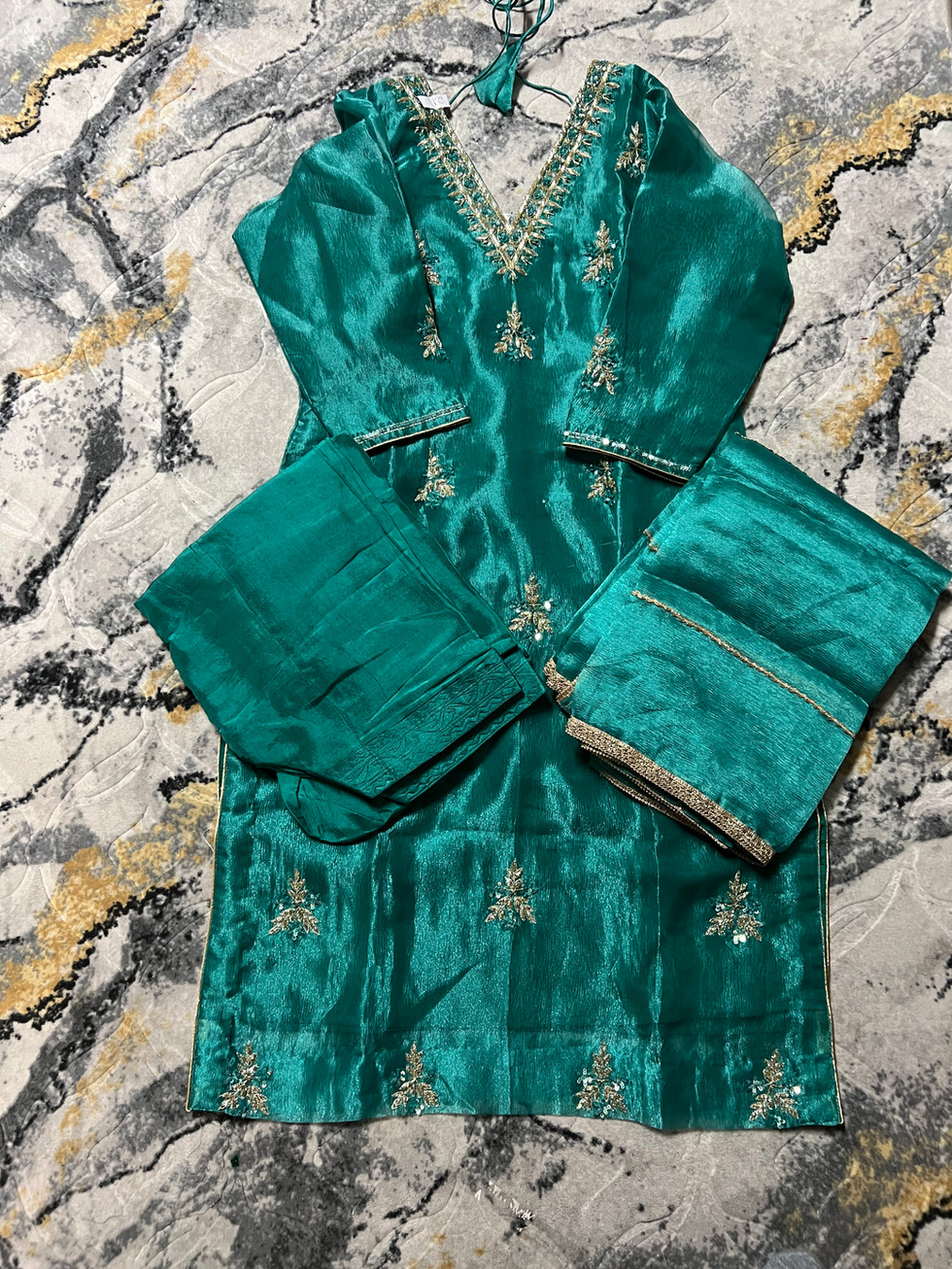 Experience the exquisite allure of Mannat Boutique's Glass Tissue Sea Green Suit. This fully stitched ensemble, meticulously crafted with glass tissue fabric, features delicate handwork on both the salwar suit and the matching dupatta. The luxurious design is complemented by a soft lining, intricate piping, and a convenient zipper, ensuring both style and comfort. Perfect for any special occasion, this suit defines elegance and sophistication. Elevate your wardrobe with a piece that resonates with quality and craftsmanship from Mannat Boutique.