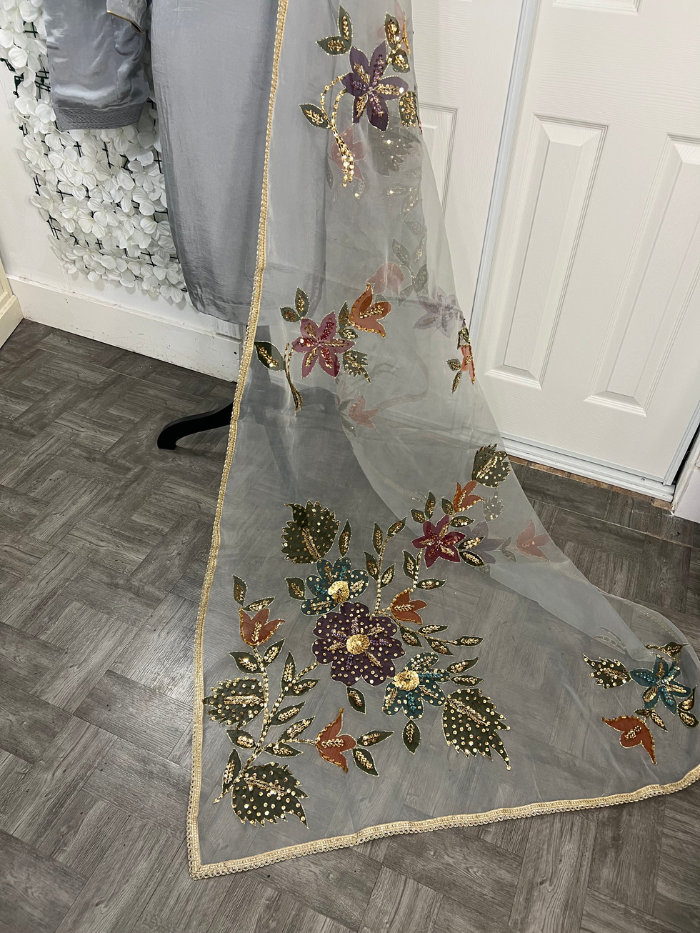 Elevate your wardrobe with the Gray Salwar Suit Code 044G from Mannat Boutique. Crafted from plain crape fabric, this fully stitched suit is enhanced with a lining for added comfort and a professional finish. The exquisite pure organza dupatta features intricate painted handwork, ensuring you stand out in elegance. Practical details like piping and a zipper make this outfit as functional as it is stylish. Embrace the artistry and quality of Indian craftsmanship with this meticulously designed ensemble.