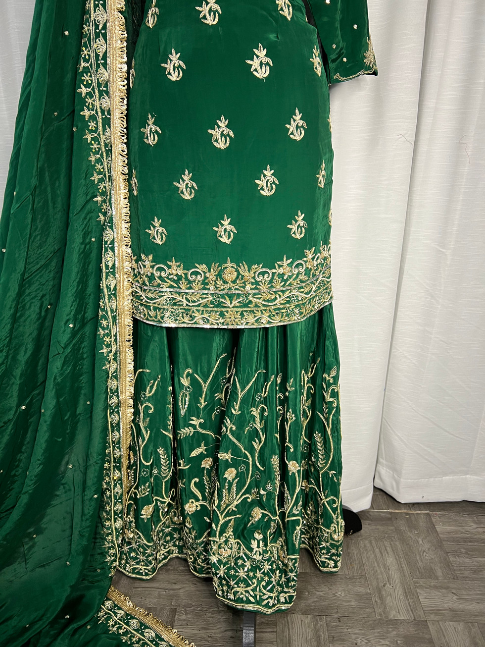 Discover the perfect blend of elegance and tradition with our Green Sharar Suit Code42G at Mannat Boutique. This exquisite ensemble features a crape fabric heavy handwork sharara suit, complemented by a luxurious pure chinon handwork duppatta with lace. The suit is fully stitched, ensuring comfort and perfection with its lining, piping, zipper, and latkan detailing. Embrace the beauty and craftsmanship of this stunning outfit, designed to make you shine at any event.