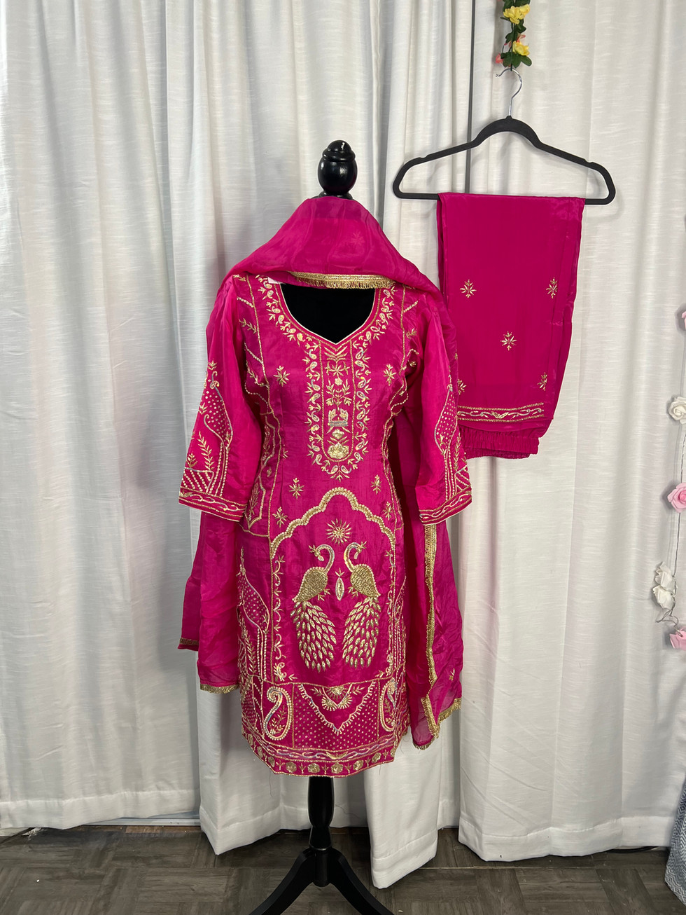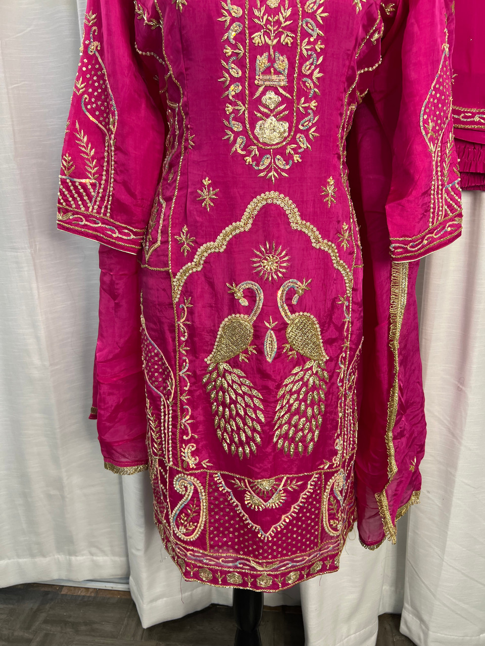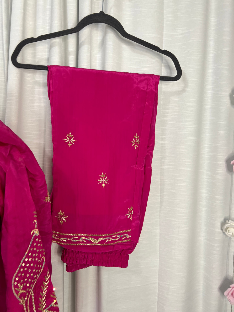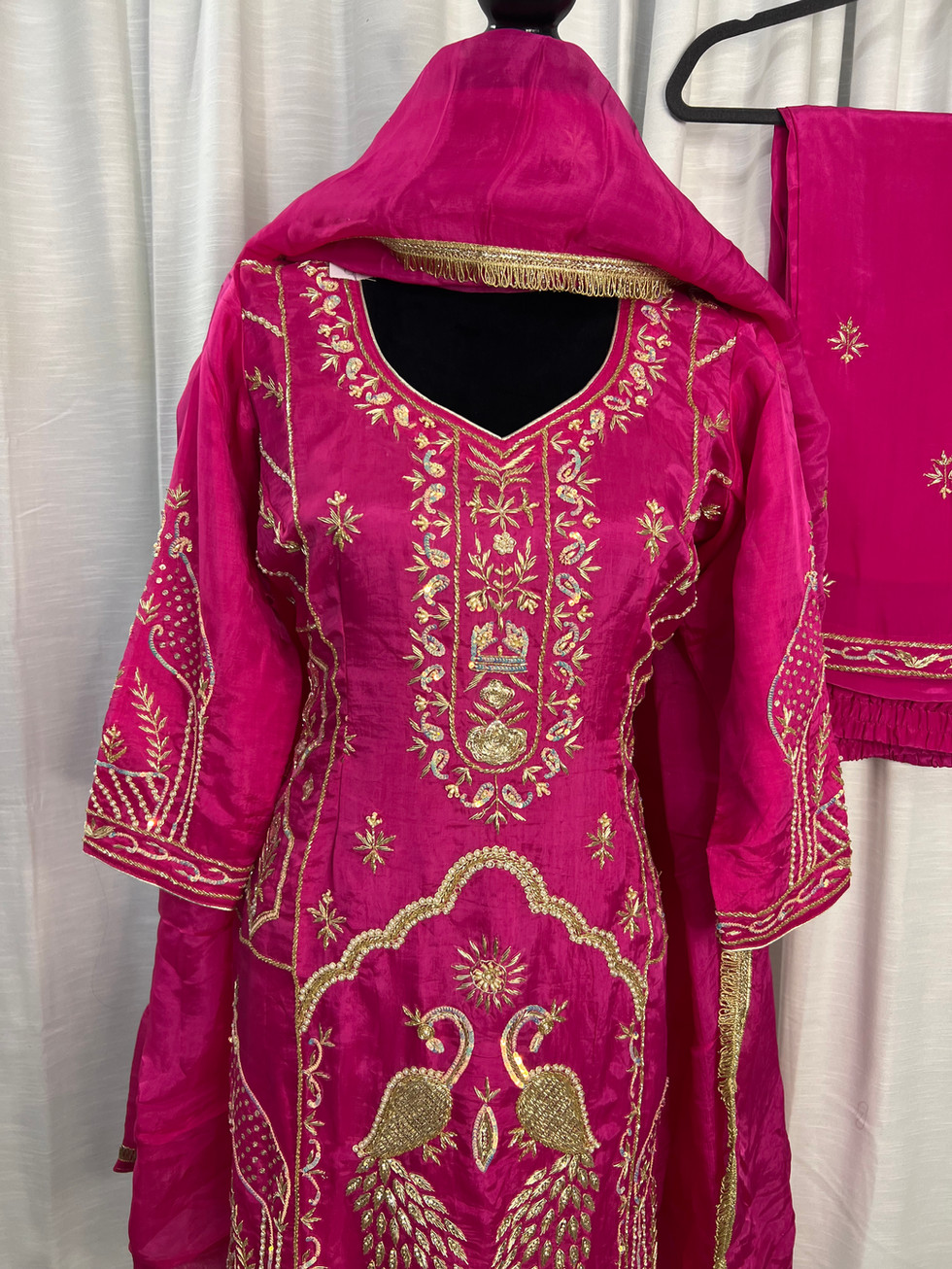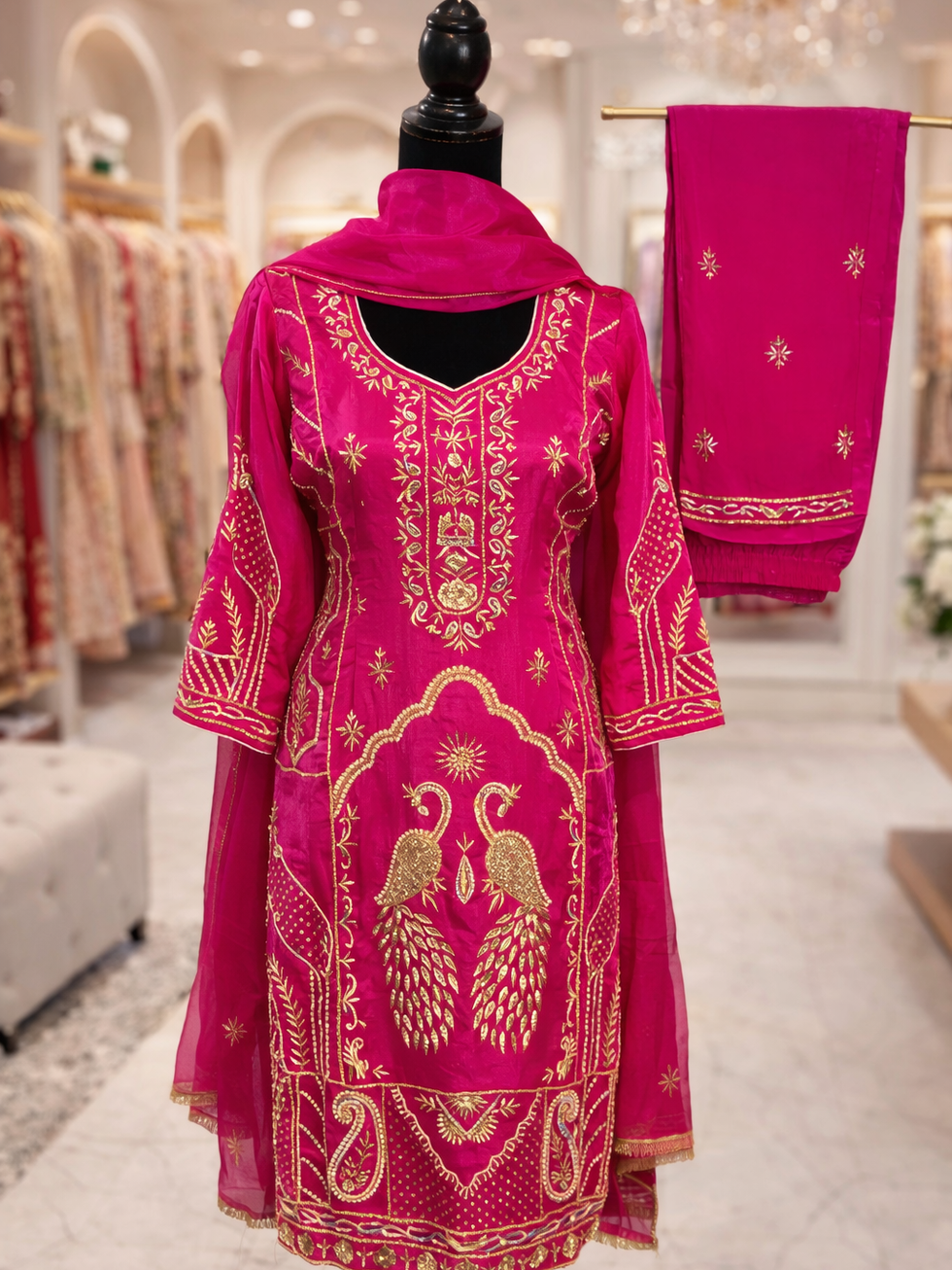 Elevate your ethnic wardrobe with the Hot Pink Handwork Pant Suit Code 40H from Mannat Boutique, crafted from exquisite viscose organza fabric featuring heavy handwork on the pant palazzo suit. This fully stitched ensemble includes lining, piping, a zipper, and delicate latkan details for a refined finish. Complemented by a pure viscose organza handwork flower dupatta adorned with intricate lace, this outfit embodies traditional elegance with contemporary comfort. Designed for those who appreciate craftsmanship and quality, it reflects Mannat Boutique’s commitment to offering premium Indian outfits that celebrate heritage and style. Experience the perfect blend of artistry and wearability with this standout piece.