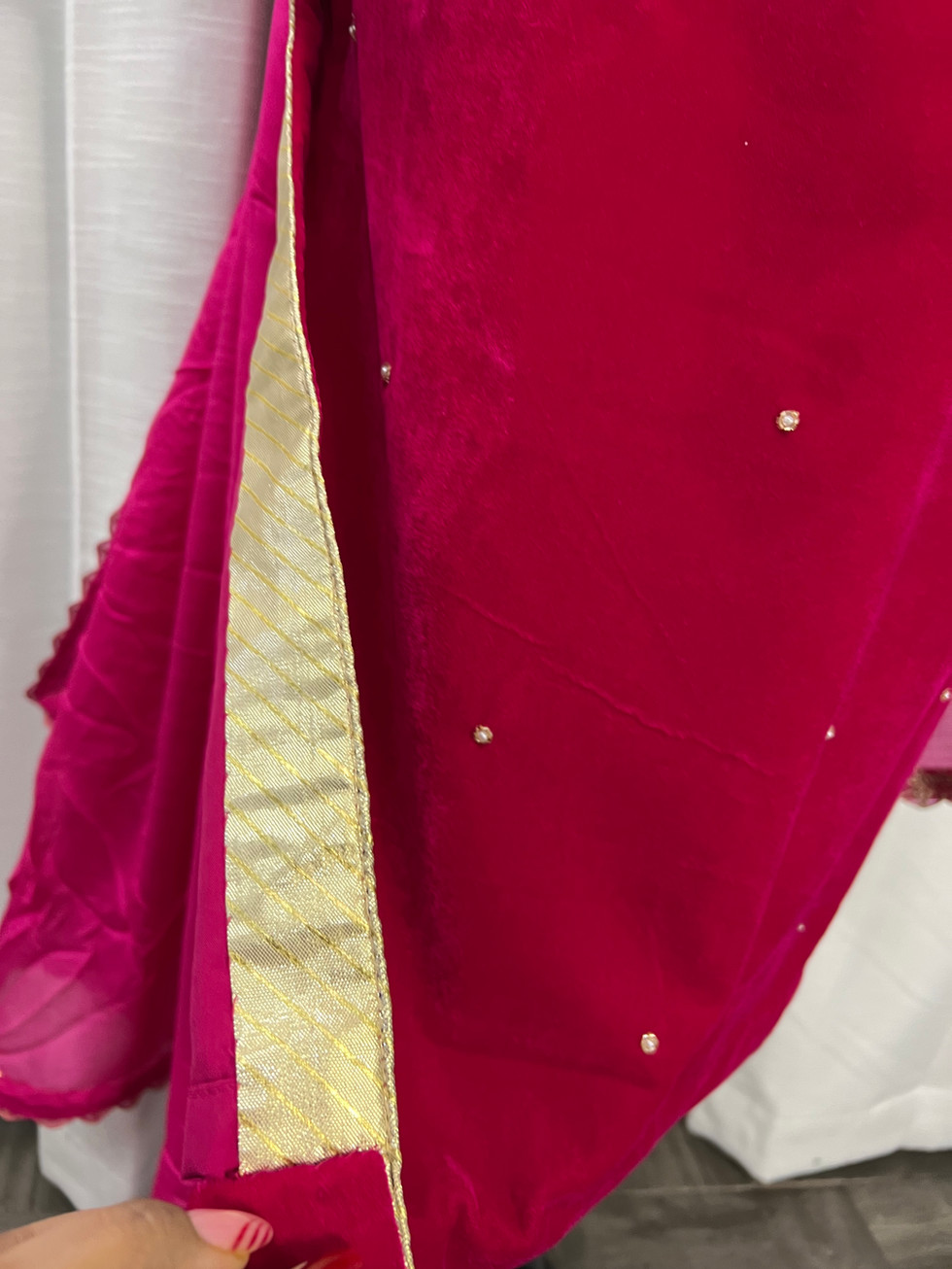 velvet fabric handwork pant palazo suit.pure chinon duppatta with beautiful lace.fully stitched suit with lining, piping with proper facing finishing,zipper and latkan in back.