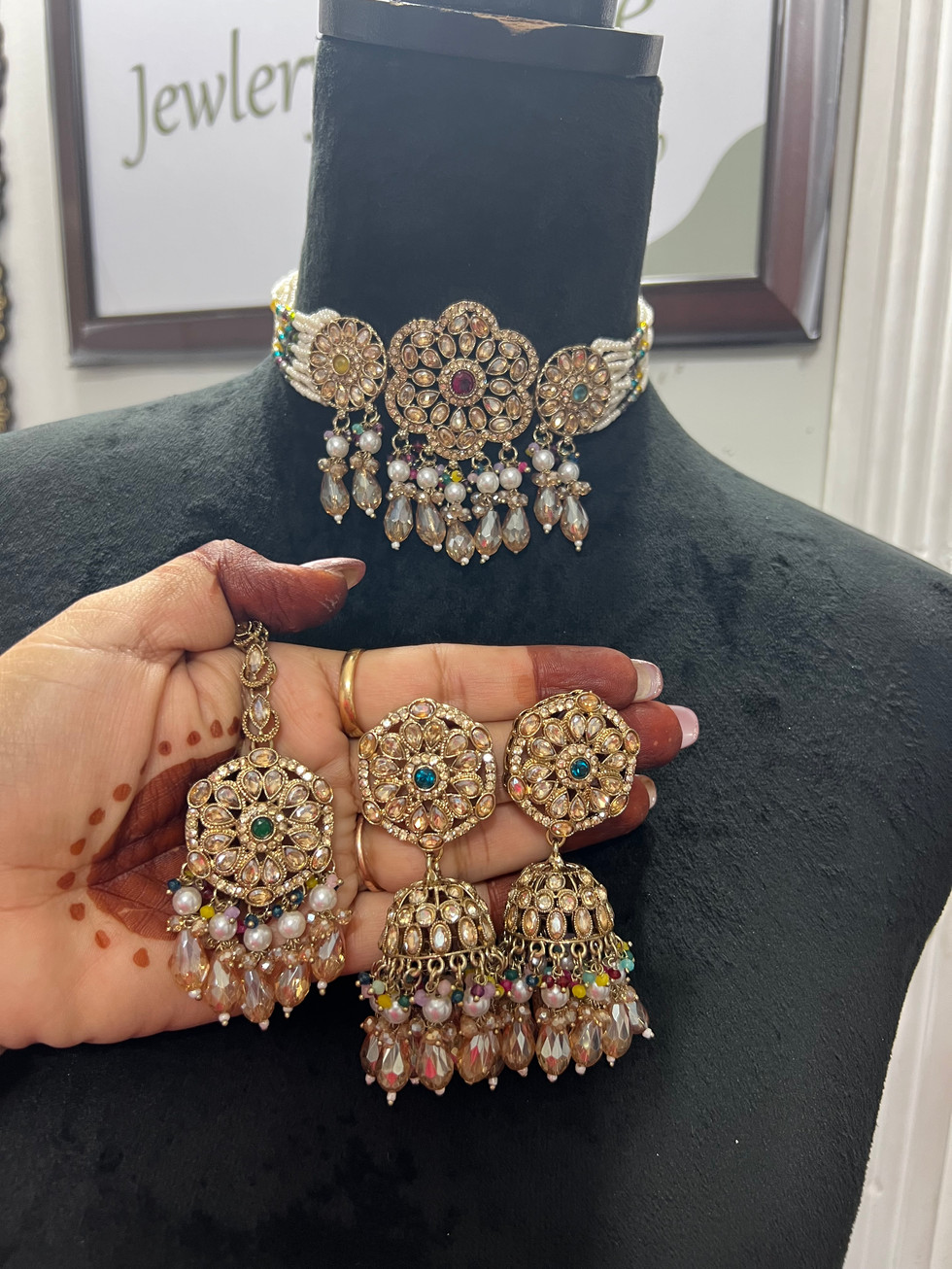 Elevate your elegance with this beautiful Kundan choker set from Mannat Boutique, complete with exquisite jhumki and tikka. This high-quality handmade piece reflects the meticulous craftsmanship we are renowned for. Perfect for special occasions, the intricate details and timeless design ensure you stand out. Embrace tradition with a touch of modern sophistication, exclusively available at Mannat Boutique.