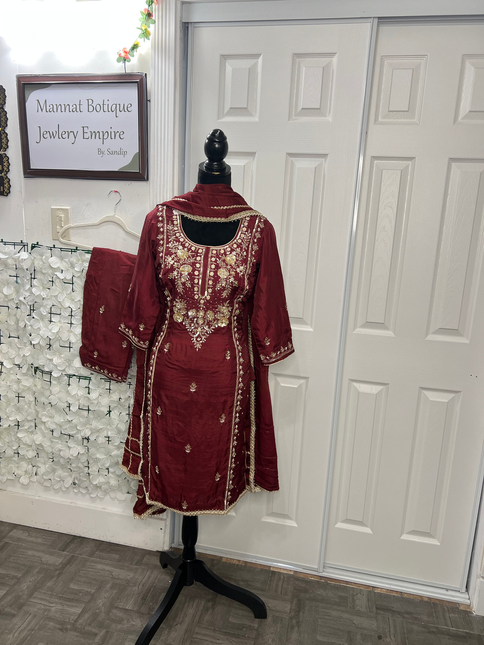 Experience the elegance of the Mehroon Raw Silk Suit Code 0400 at Mannat Boutique. This pure Raw silk handwork salwar suit comes with a pure chinon dupatta, accentuated with golden lace that adds a touch of luxury. The salwar suit is fully stitched with a lining for added comfort and features meticulous piping and a convenient zipper. Ideal for any special occasion, this suit embodies the perfect blend of tradition and sophistication, making it a must-have addition to your Indian outfit collection. Discover unparalleled craftsmanship and style with this exquisite piece from Mannat Boutique.