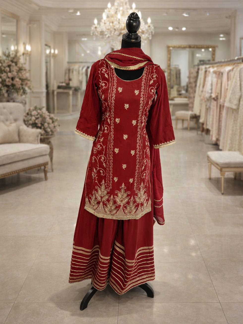 Experience elegance with the Mehroon Sharara Suit Code 36, crafted from premium crape fabric featuring delicate handwork that embodies traditional artistry. This fully stitched sharara suit includes lining, piping, a zipper, and a latkan at the back for a perfect fit and refined finish. Complemented by a pure chinon dupatta adorned with lace, it offers a graceful and sophisticated ensemble ideal for any festive occasion. At Mannat Boutique, we prioritize quality and attention to detail, ensuring each outfit reflects the rich heritage of Indian fashion. Elevate your wardrobe with this exquisite piece that seamlessly blends comfort and style.
