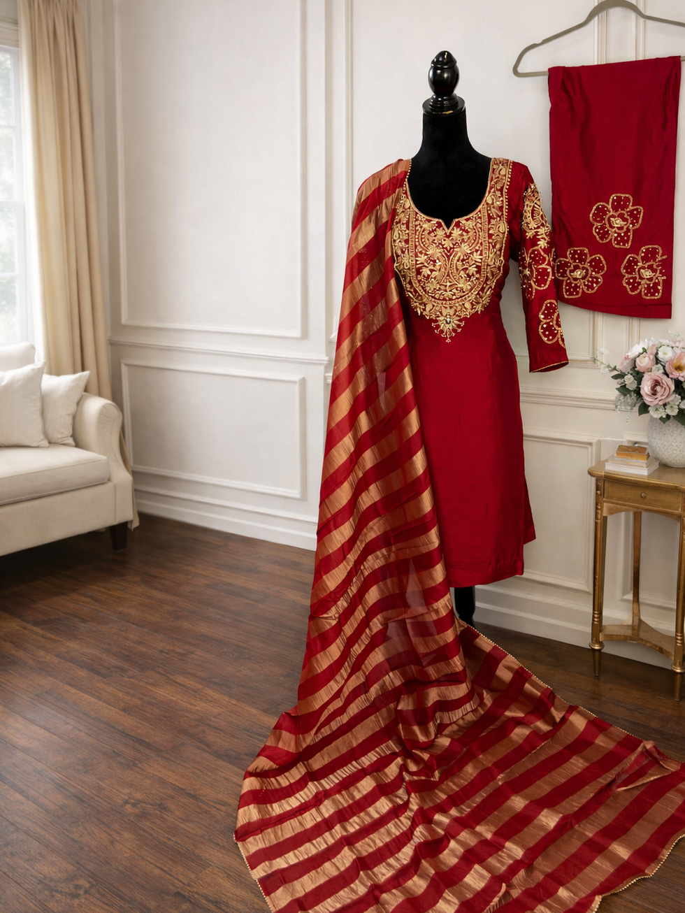 Experience elegance with the Mehrooon Handwork PalazzoSuit code 42, crafted from premium raw silk fabric and detailed with exquisite handwork. This fully stitched suit features beautiful lines, complemented by a graceful dupatta and thoughtful finishes including liming, piping, a concealed zipper, and latkan at the back for a perfect fit. At Mannat Boutique, we prioritize quality and craftsmanship, offering Indian outfits that blend tradition with contemporary style. Elevate your wardrobe with this sophisticated palazzo suit designed for comfort and timeless appeal. Shop with confidence knowing you receive meticulous tailoring and authentic designs.