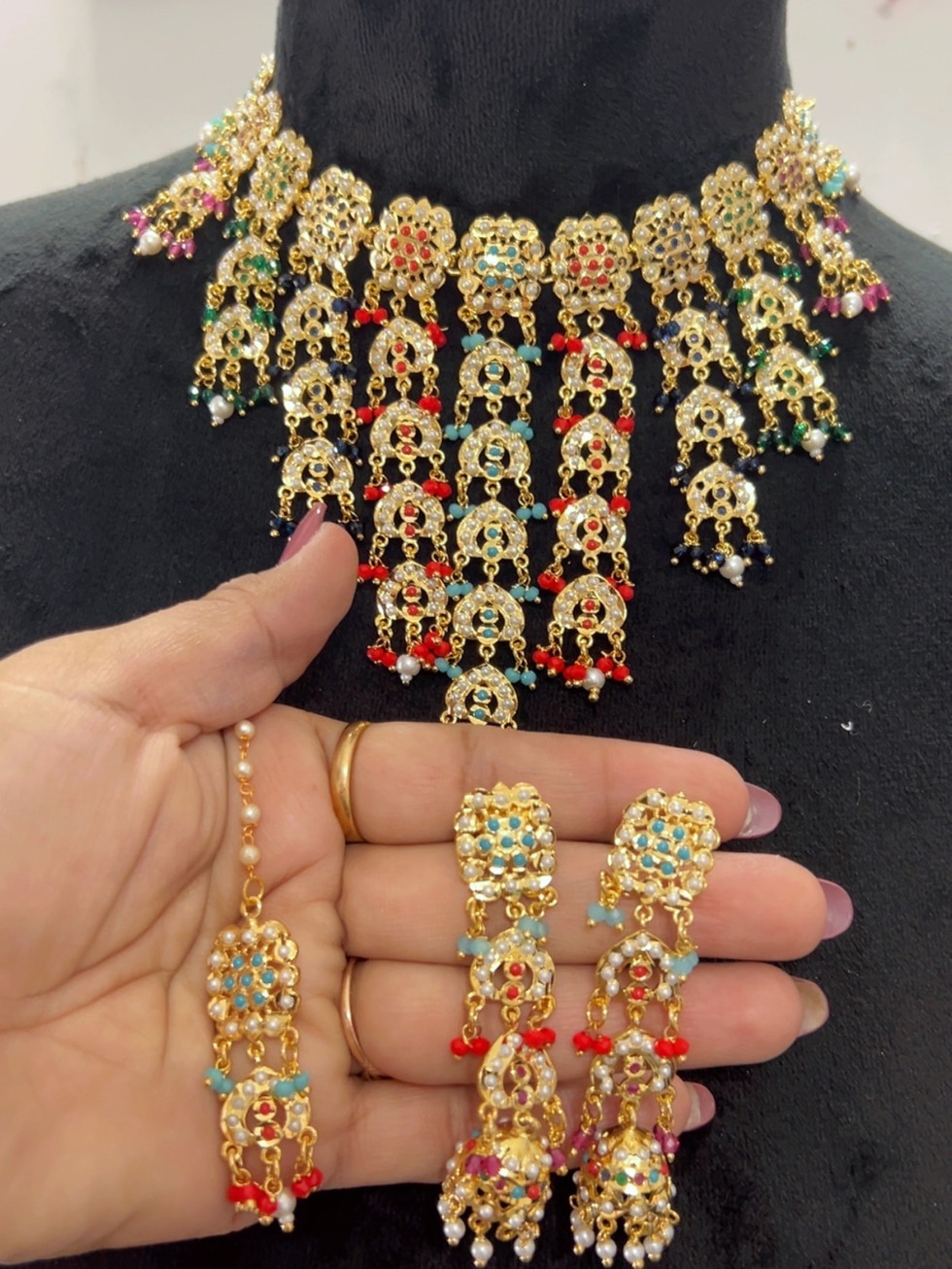 Discover timeless elegance with our high quality gold plated multi set with earrings, exclusively at Mannat Boutique. This meticulously crafted set exudes sophistication, ensuring that you make a statement at every event. At Mannat Boutique, we pride ourselves on offering only the finest selections, and this exquisite set is no exception. Perfect for any special occasion, its luxurious gold plating and intricate detailing promise durability and unparalleled beauty. Elevate your style with a touch of classic charm from our curated collection.