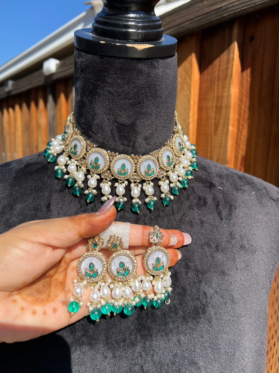 Discover the epitome of elegance with our high-quality pearlescent and kundan mosonight stone neckles set, exclusively available at Mannat Boutique. This exquisite set features finely crafted earrings, tikka, and neckles, perfect for adding a touch of sophistication to any ensemble. Designed with meticulous attention to detail, our neckles set reflects the luxurious essence of traditional craftsmanship combined with contemporary style. Trust in Mannat Boutique's commitment to quality and service as you elevate your accessory game with this stunning piece. Experience true luxury and timeless beauty with our high quality peals and kundan mosonight stone heckles set.earings ,tikka and heckles..
