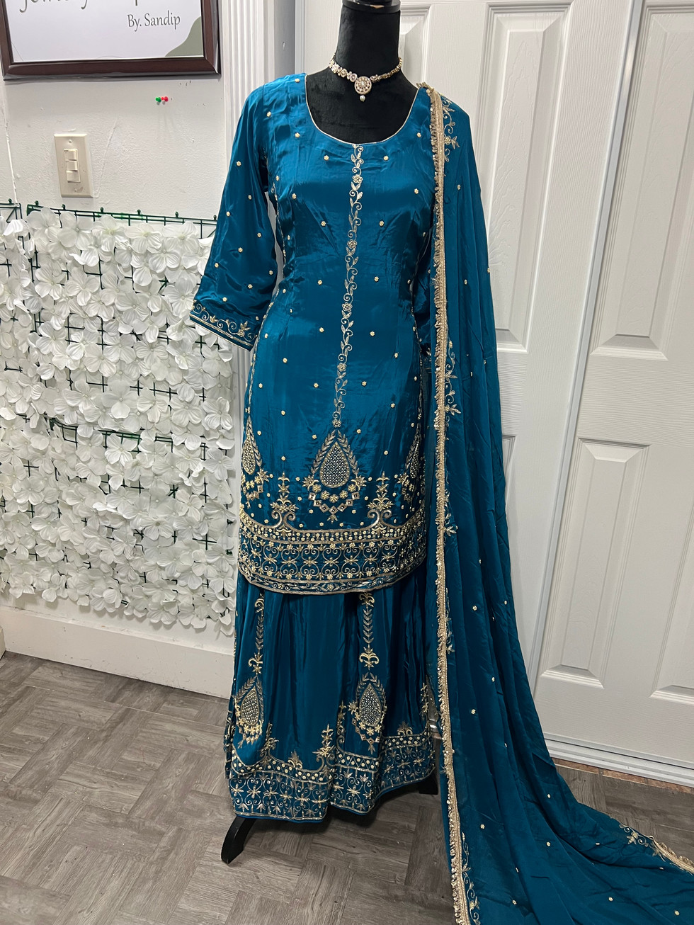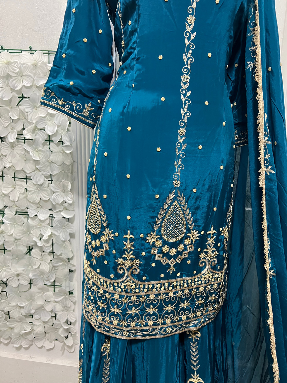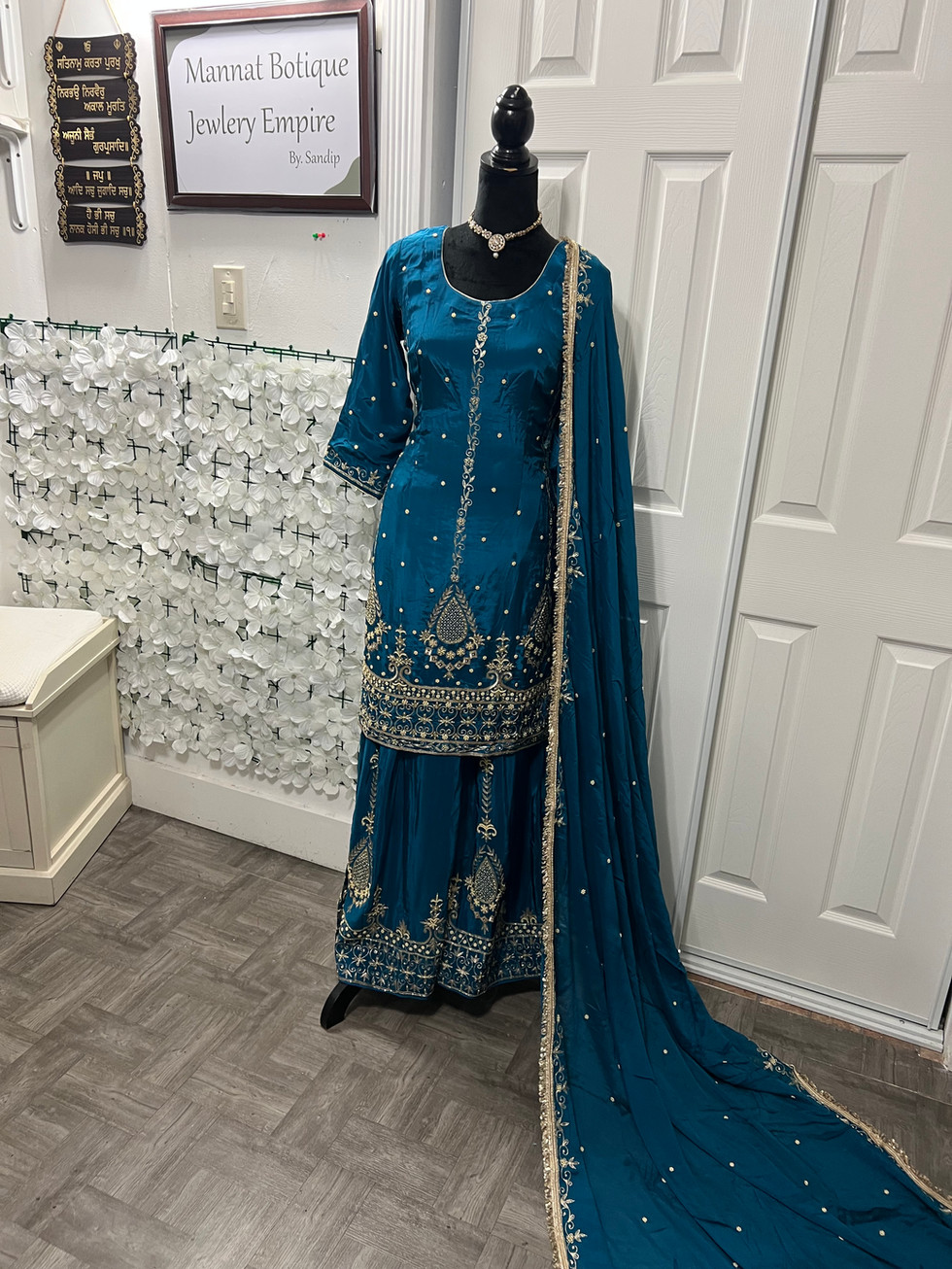 Experience the allure of our Peacock Color Sharara Suit from Mannat Boutique, meticulously crafted in luxurious Crepe fabric. This ensemble features fully handwork detailing across the sharara shirt and dupatta, adding a touch of timeless elegance. Made from pure chinon and stitched with precision, it includes lining, piping, and a convenient zipper for a perfect fit. Immerse yourself in unmatched sophistication and comfort with this expertly designed outfit.