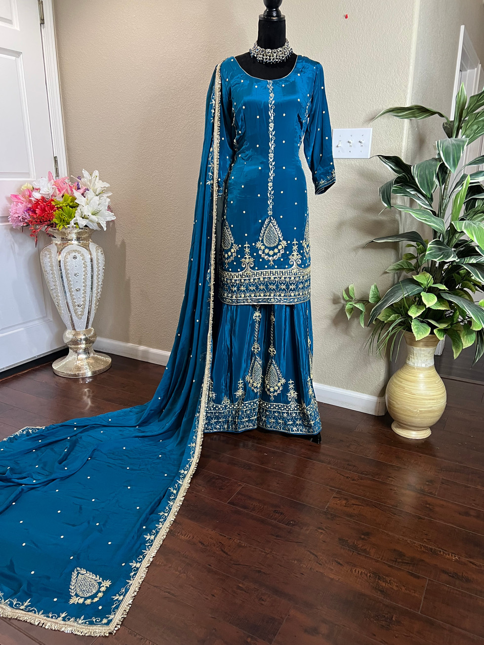 Discover the enchanting Peacock Sharara Suit Code042PE at Mannat Boutique, your go-to store for exquisite Indian outfits. This crape fabric heavy handwork sharara suit is paired with a pure chinon dupatta adorned with intricate handwork and golden lace, elevating its elegance. Fully stitched and designed with precision, it includes a comfortable lining, refined piping, and a convenient zipper, ensuring a flawless fit and finish. Perfect for any special occasion, this ensemble embodies sophistication and traditional artistry. Embrace timeless beauty and unparalleled craftsmanship with this exquisite outfit.