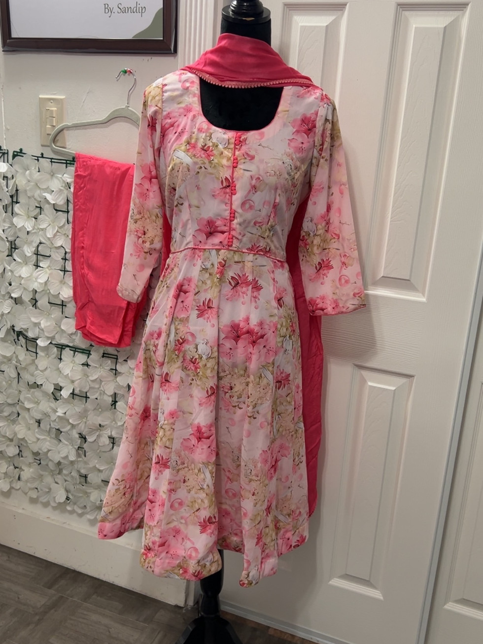 Experience timeless elegance with Mannat Boutique's handmade Pink Flower Anarkali Suit. This exquisite ensemble features a beautifully designed Anarkali suit paired with a plain pant Palazzo, crafted from pure Chinon fabric for an elegant drape. The accompanying Duppata, adorned with beautiful laces, adds a touch of sophistication to the overall look. Perfect for any special occasion, this outfit showcases our commitment to quality and craftsmanship. Dress in style and make a lasting impression with our Pink Flower Anarkali Suit.