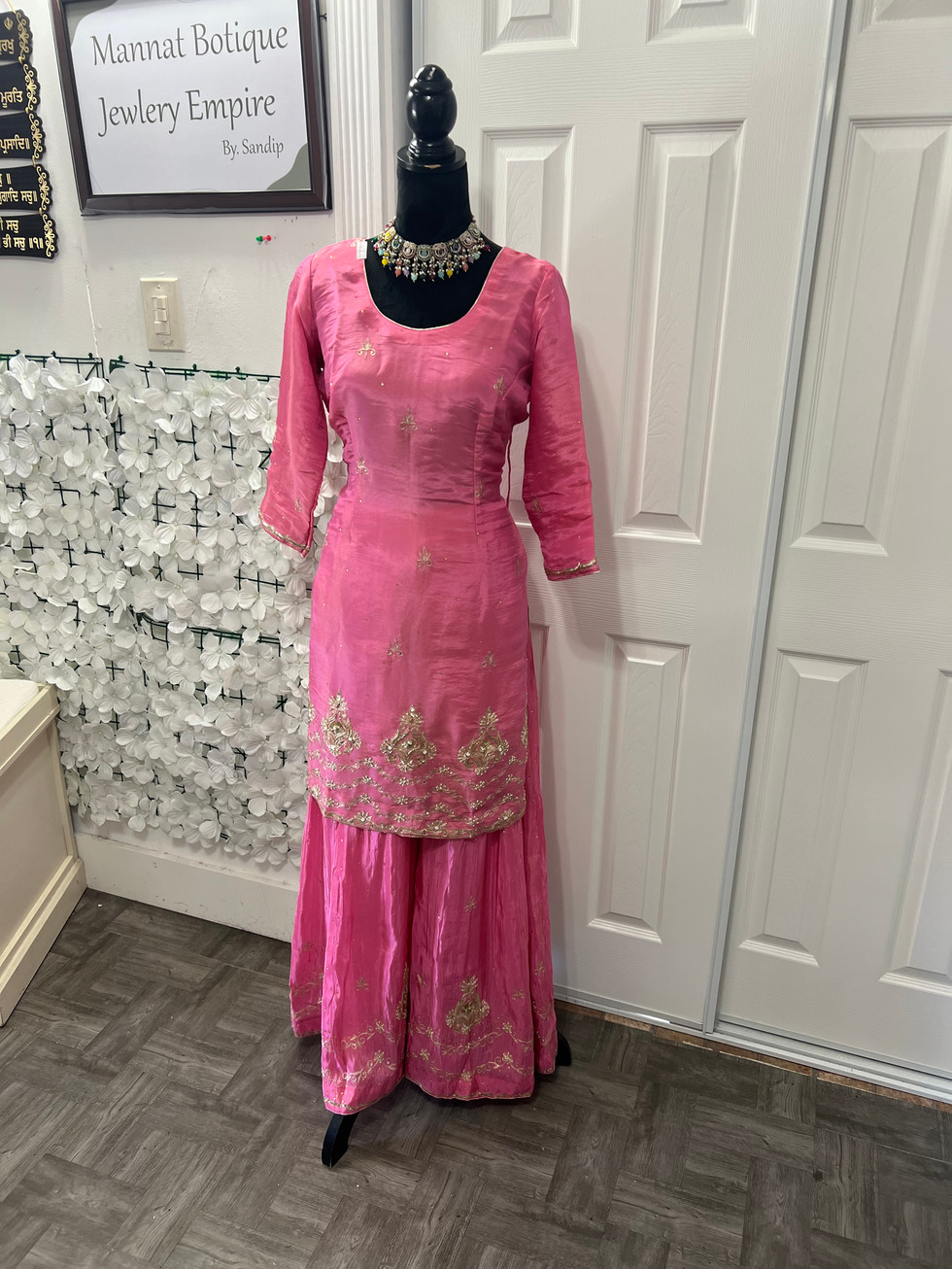 Elevate your wardrobe with the exquisite Pink Handwork Sharara Suit from Mannat Boutique. Crafted from luxurious shimmer fabric, this ensemble features a handwork shirt and a pure crepe sharara adorned with heavy handwork, ensuring a perfect blend of tradition and elegance. The outfit includes a pure chinon dupatta, fully embellished with handwork, enhancing its grace and charm. Designed with precision, it also offers a comfortable inner lining, a convenient zipper, and is beautifully stitched with delicate piping. Immerse yourself in unmatched sophistication and craftsmanship with this stunning suit, tailored to perfection for those who appreciate timeless beauty.