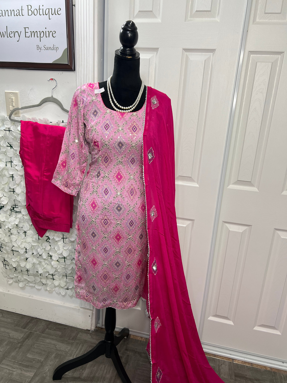 Discover elegance with our Pink Salwar Suit Code 036P, exclusively at Mannat Boutique. This stunning ensemble features a Chinon fabric handwork shirt paired with a stylish Palin salwar. The pure Chinon dupatta is adorned with exquisite border handwork and lace, adding a touch of sophistication. The fully stitched suit ensures a perfect fit with its lining, piping, and convenient zipper. Elevate your traditional wardrobe with this beautifully crafted outfit, reflecting the best of Indian fashion.