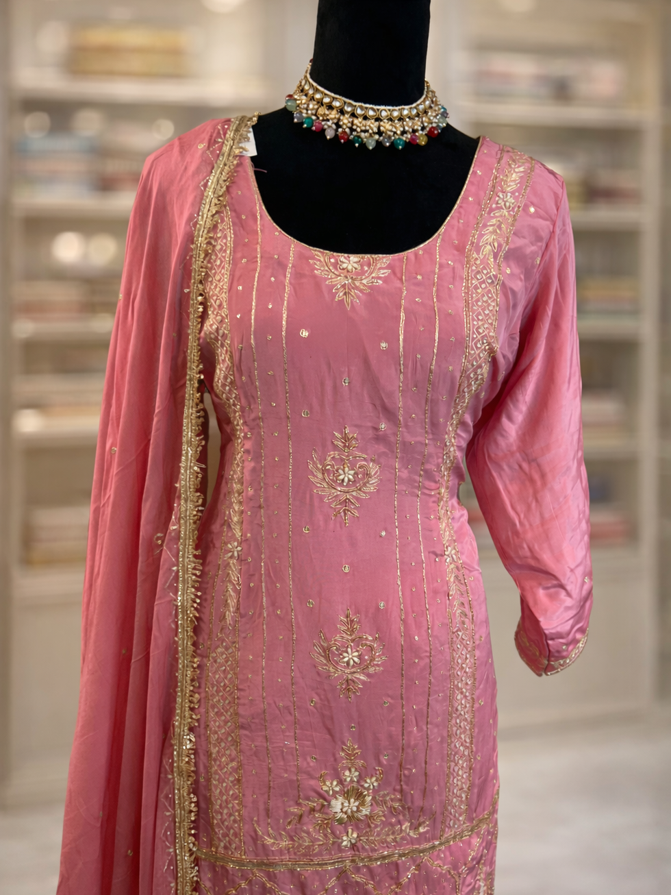 Experience the elegance of the Pink Sharara Suit Code48PK, crafted with exquisite crape fabric and adorned with intricate tilla arri heavy handwork, available exclusively at Mannat Boutique. This fully stitched sharara suit features lining, piping, and a convenient zipper, ensuring both comfort and a perfect fit. Complemented by a pure chinon dupatta enhanced with delicate lace work, it offers a harmonious blend of traditional craftsmanship and contemporary style. The latkan detail on the back adds a charming finishing touch, reflecting Mannat Boutique’s commitment to quality and refined Indian outfits. Elevate your wardrobe with this sophisticated ensemble designed for timeless grace and effortless elegance.