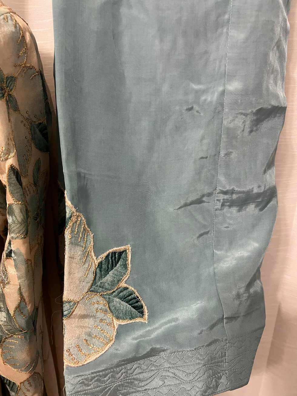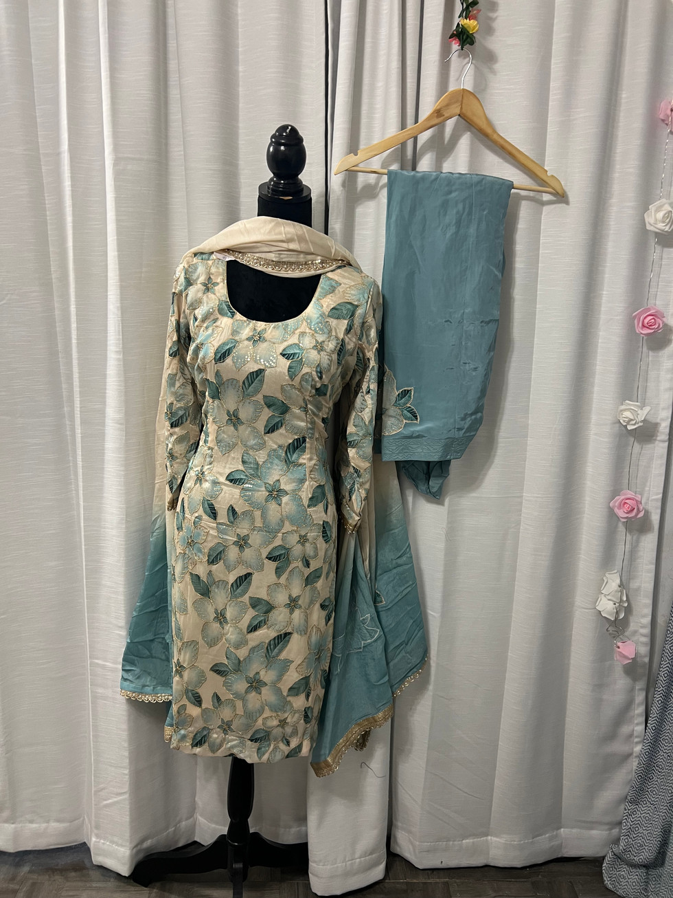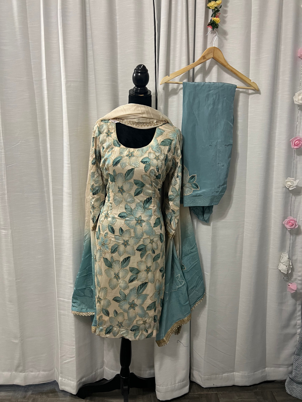 Embrace elegance with Print Work Salwar Suit Code46 from Mannat Boutique, featuring a stunning shimmer fabric shirt adorned with print sequence work and crape patch details. This meticulously crafted suit includes a fully stitched design with lining, piping, zipper, and latkan for seamless wear. Complementing the ensemble, the pure chinon patch work dupatta embellished with golden pearl work adds a touch of sophistication. Perfect for special occasions, this salwar suit exemplifies our dedication to quality and intricate craftsmanship. Elevate your wardrobe with this exquisite addition from our curated Indian outfits collection.