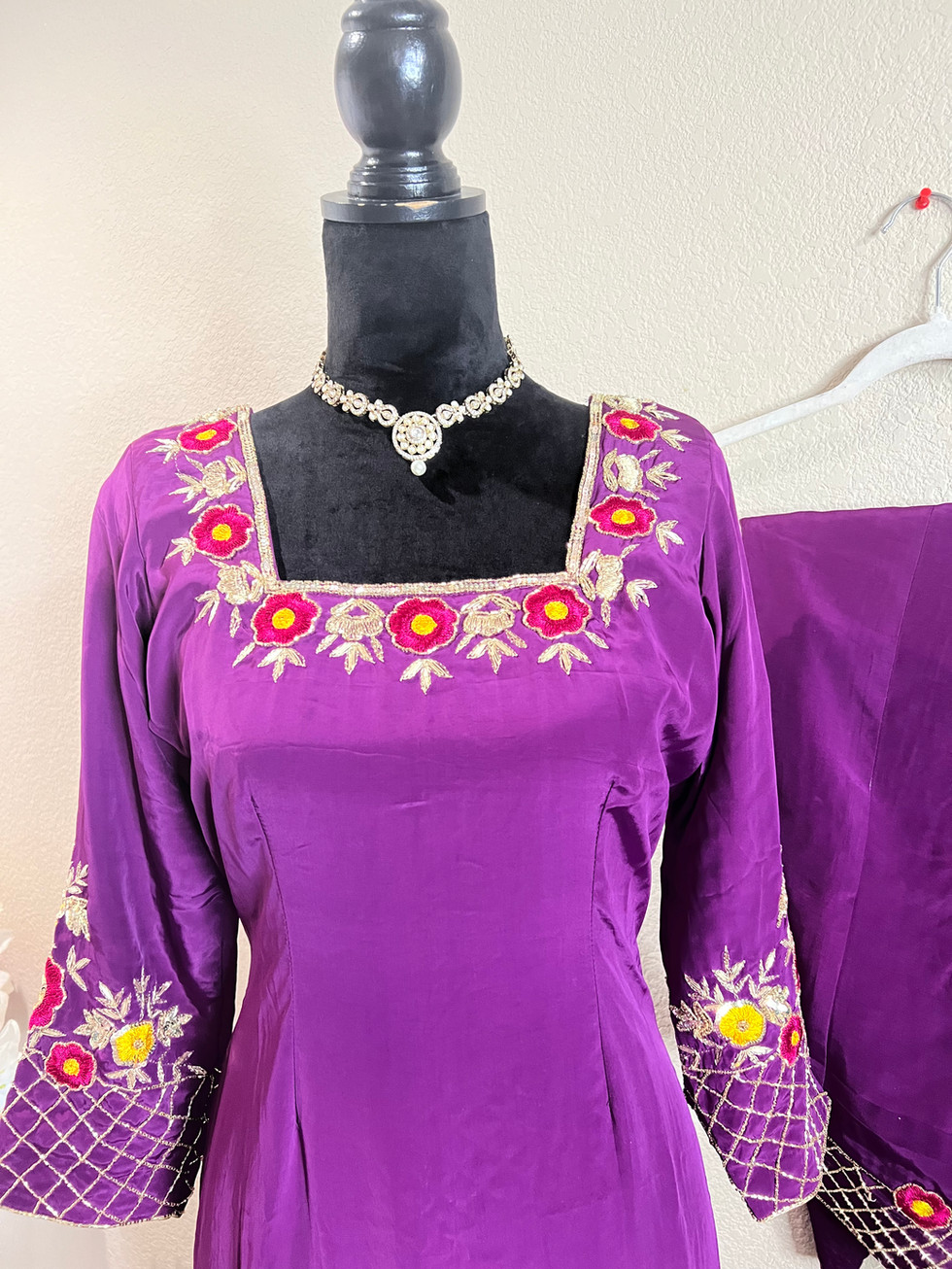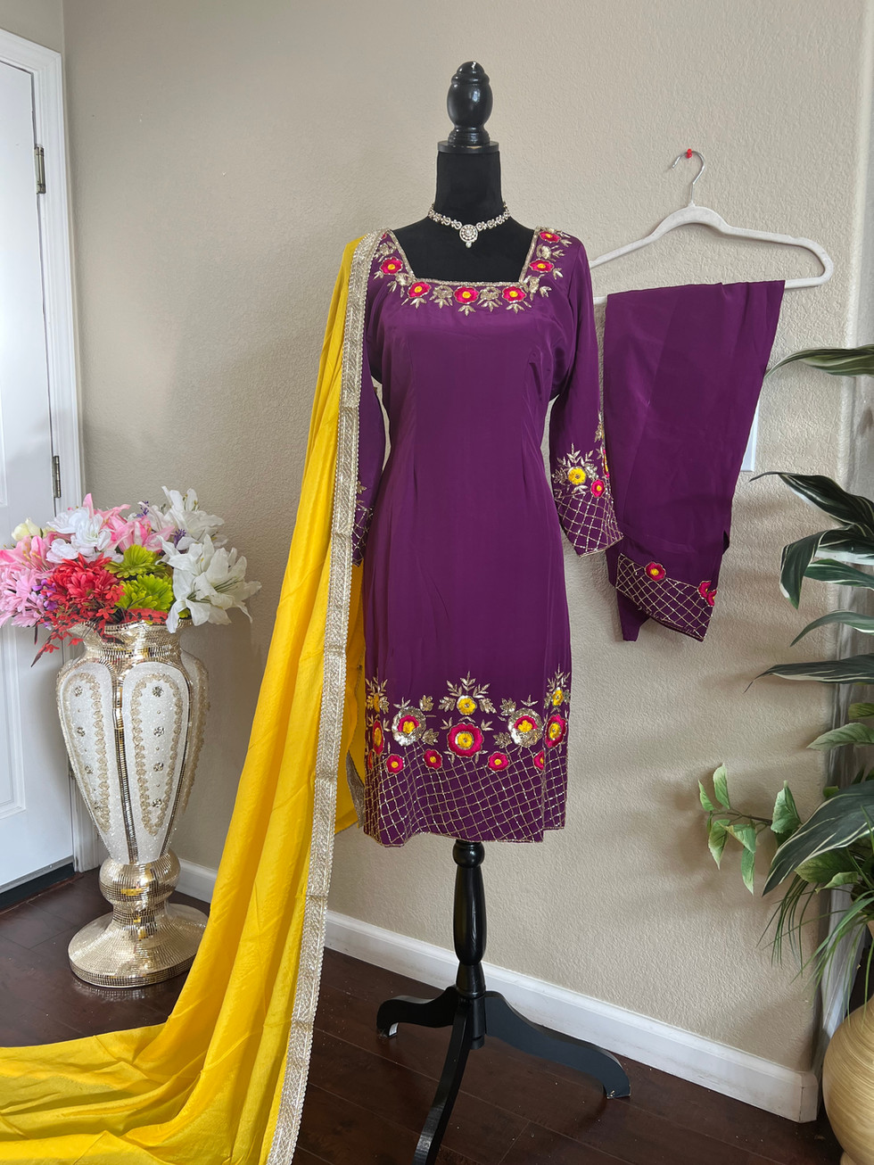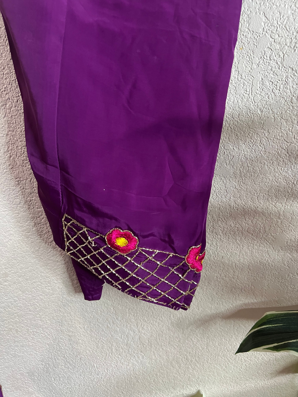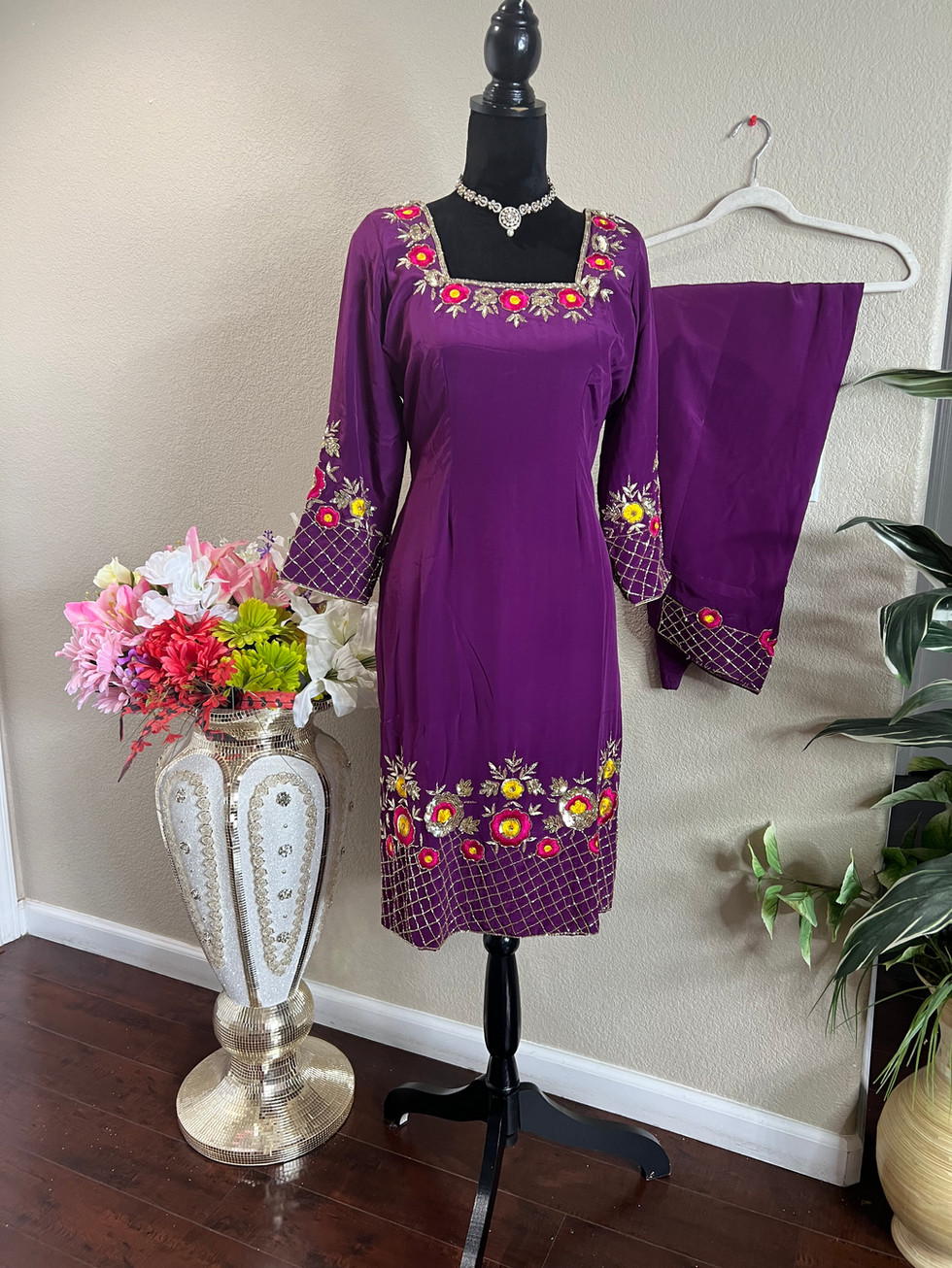 Elevate your wardrobe with Mannat Boutique's Purple Handwork Salwar Suit Code 040P. Crafted from luxurious crape fabric, this fully stitched suit features intricate handwork, ensuring you stand out at any occasion. Accompanied by a pure chinon dupatta adorned with an elegant golden lace, the ensemble is completed with meticulous lining, piping, and a seamless zipper. Experience the perfect blend of tradition and modernity with this must-have outfit.