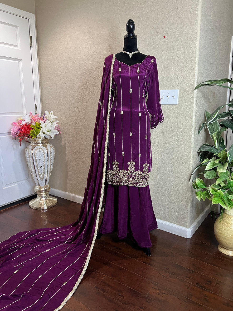 Elevate your ethnic wardrobe with the stunning Purple Sharara Suit Code 050 from Mannat Boutique. This exquisite ensemble features a crape fabric handwork sharara suit paired with a luxurious pure chinon dupatta, both adorned with intricate handwork. Designed for your comfort and convenience, the fully stitched suit includes lining, piping, and a zipper for a polished finish. Perfect for any special occasion, this suit showcases Mannat Boutique’s commitment to quality and elegance in Indian outfits. Embrace the beauty and sophistication of traditional craftsmanship with this remarkable piece.