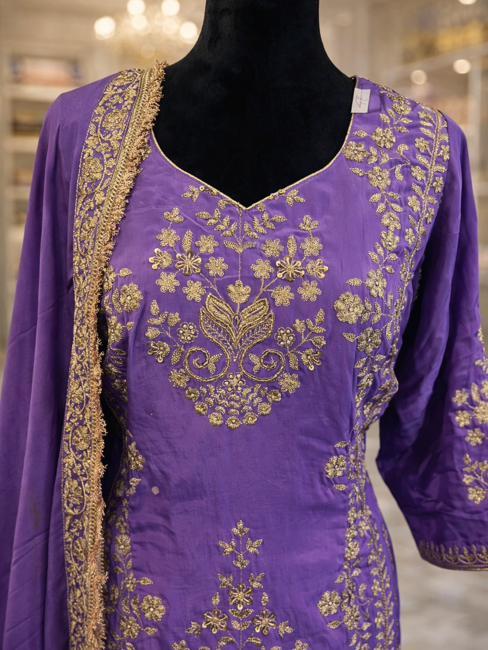 Experience elegance with the Purple Sharara Suit Code48P from Mannat Boutique, crafted in crape fabric featuring all tilla arri heavy handwork for a rich and refined look. This fully stitched suit comes with lining, piping, and a convenient zipper, enhanced by delicate latkan detailing on the back for a perfect finish. Complemented by a pure chinon dupatta with intricate work, it embodies the craftsmanship and quality Mannat Boutique stands for. Ideal for festive occasions, this ensemble blends traditional artistry with contemporary comfort seamlessly. Elevate your ethnic wardrobe with this stunning sharara suit designed to make a graceful statement.