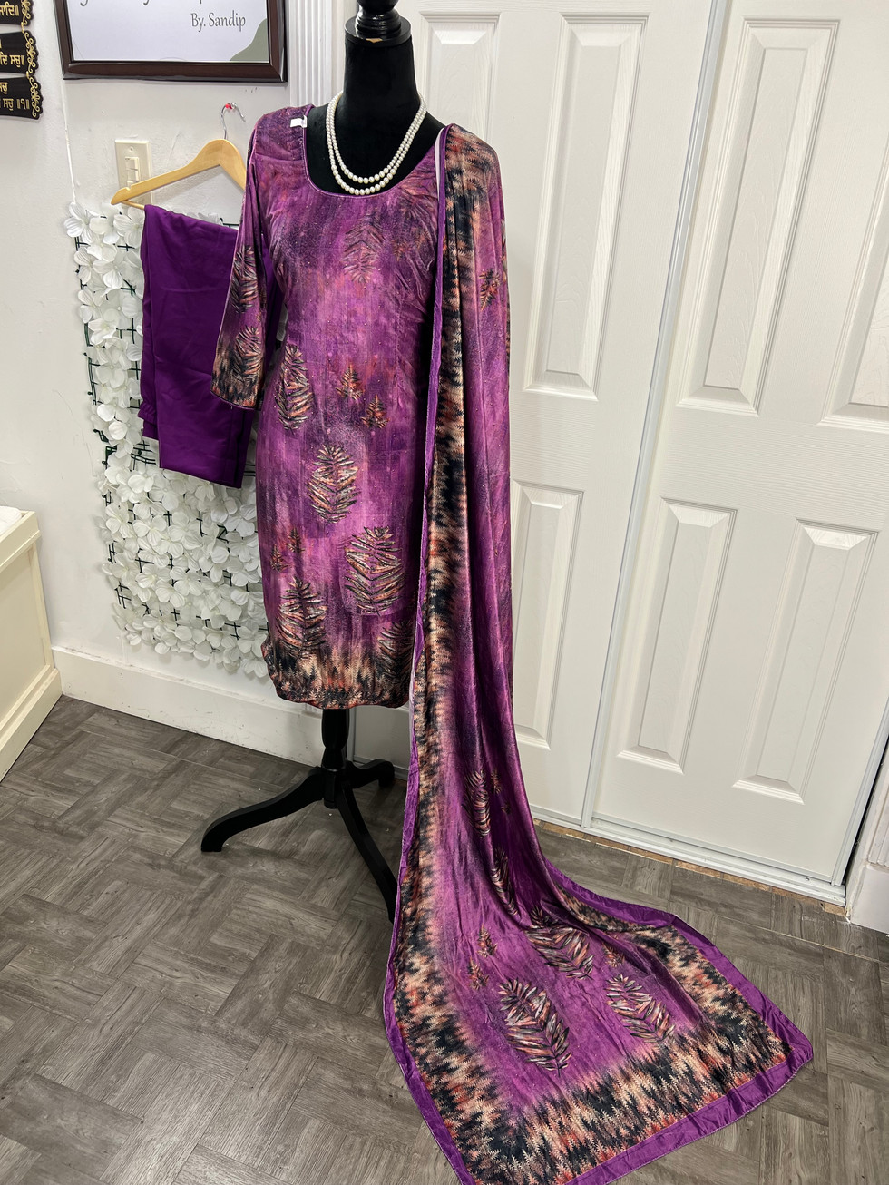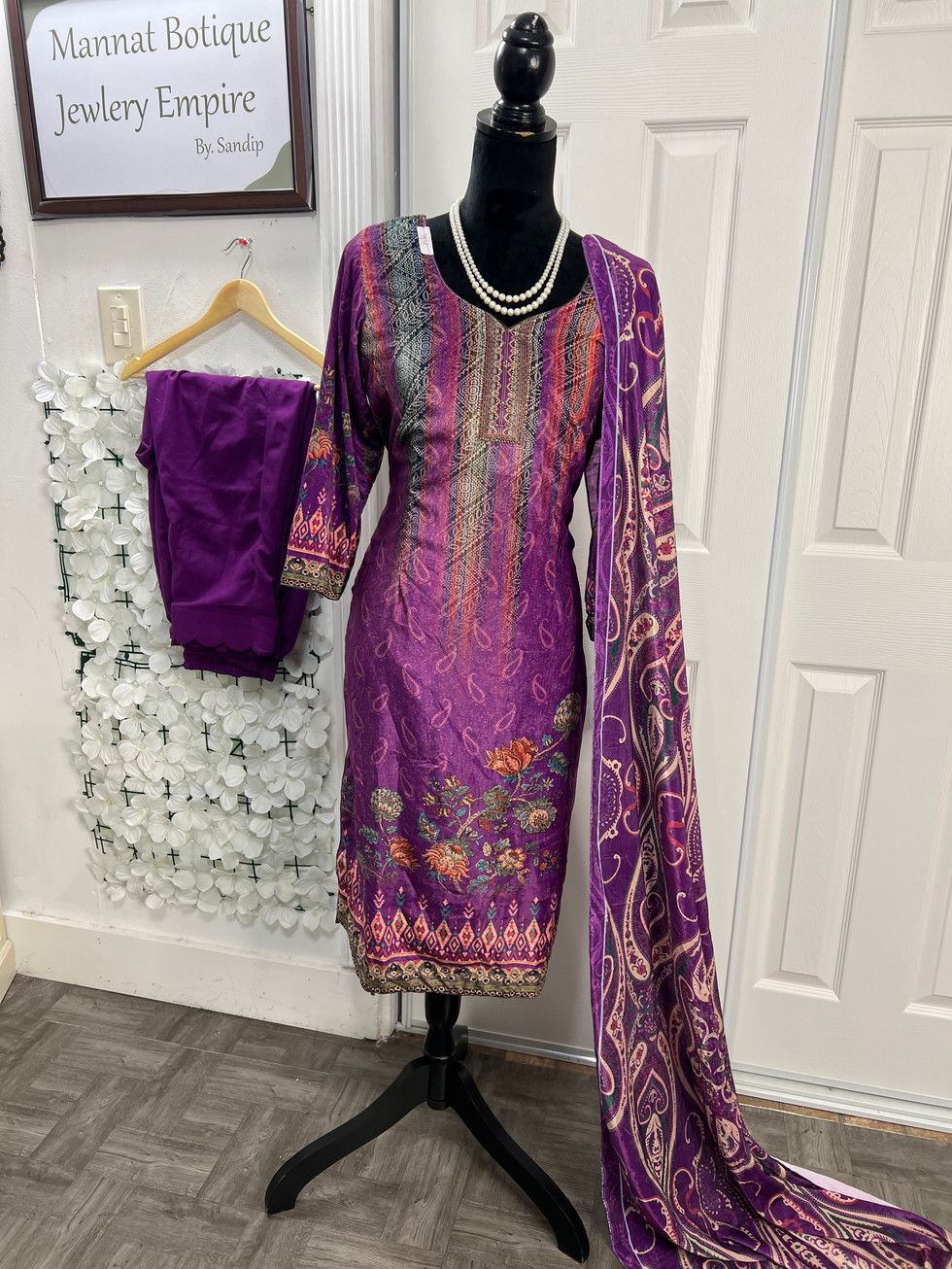 Indulge in the luxurious elegance of Mannat Boutique's Purple Velvet Print Salwar Suit code 044p. This stunning ensemble features a pure velvet print shirt paired with a plain pashmina shawl salwar, fully stitched with a comfortable lining. Perfect for any formal occasion, this meticulously crafted outfit showcases our dedication to quality and elegance. Elevate your wardrobe with this unique and stylish Indian outfit, embodying the rich tradition and modern sophistication Mannat Boutique is known for.
