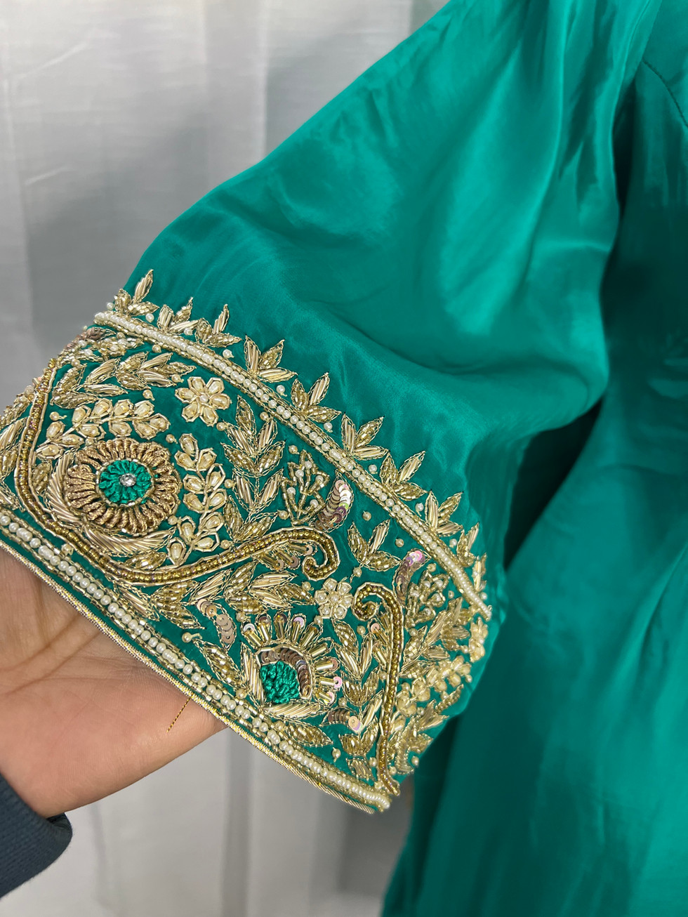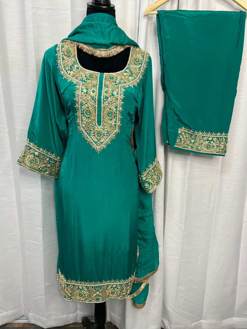 Introducing the exquisite Raman Green Farshi Salwar Suit Code46RG, a masterpiece from Mannat Boutique. Crafted from crape fabric, this handwork shirt and salwar ensemble exudes elegance. Accompanied by a pure chinon dupatta adorned with golden lace, it adds a touch of regality. This fully stitched suit comes complete with lining, piping, zipper, and dori for added comfort and style. Elevate your ethnic wardrobe with this timeless piece, perfect for any special occasion.
