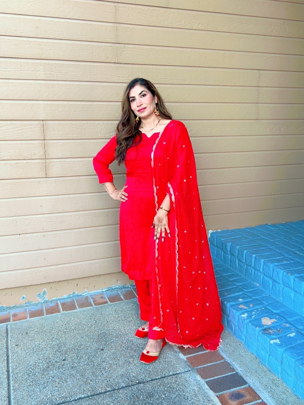 Step into elegance with Mannat Boutique's exclusive Red Palazo Suit. This exquisite ensemble, fashioned from premium Georgette Fabric, features a pant palazzo suit paired with a beautiful handwork dupatta. The suit is fully stitched and includes a soft lining, with zipper and dori additions ensuring maximum comfort and ease of wear. Graceful golden piping accentuates the intricate handwork, making this handmade suit a perfect blend of tradition and contemporary style. Elevate your wardrobe with this stunning piece that embodies Mannat Boutique’s commitment to quality and superior craftsmanship.