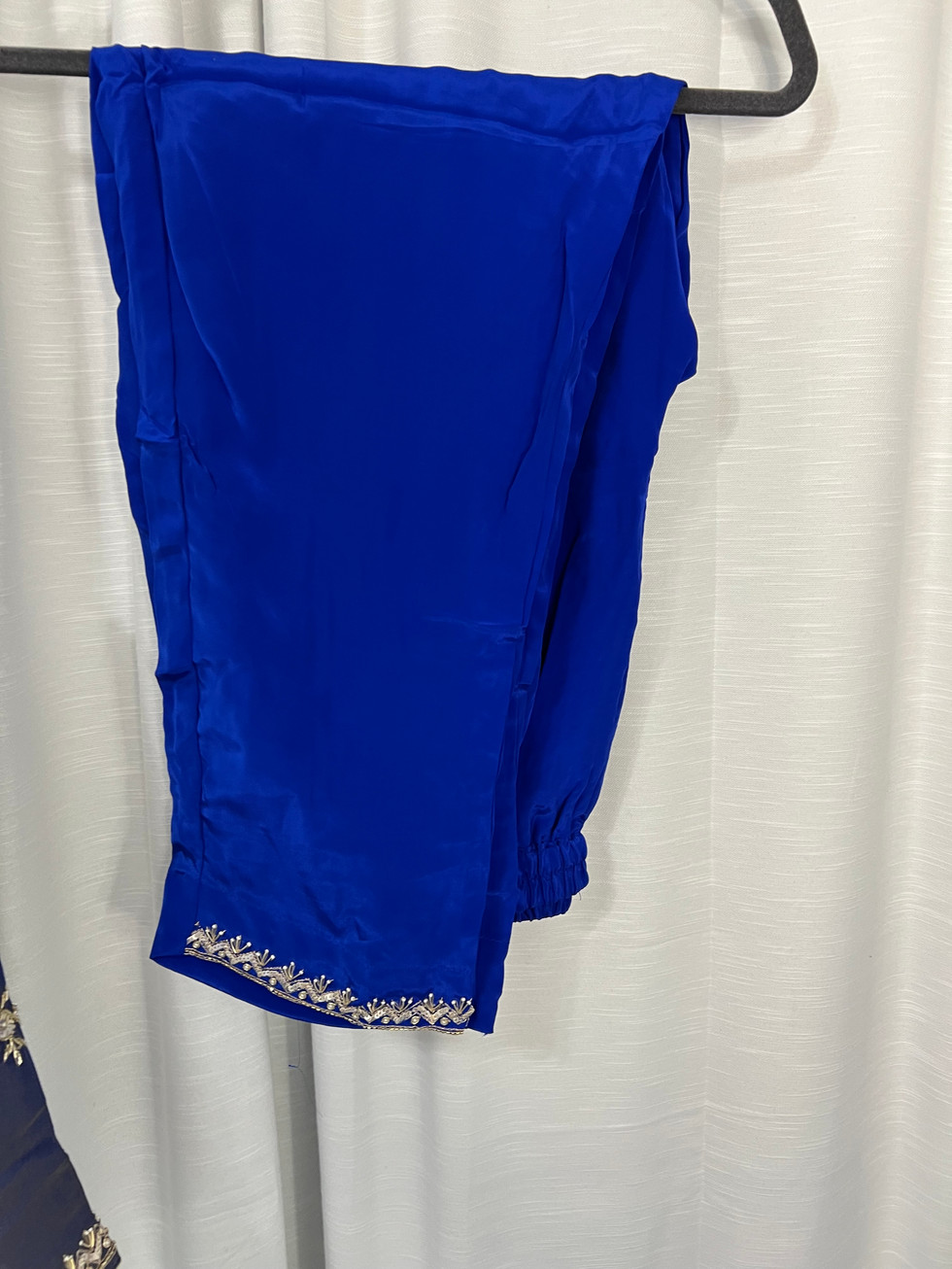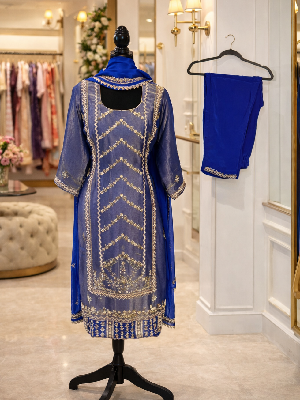 Experience elegance with the Royal Blue Shimmer Pant Palazo Suit Code 44 from Mannat Boutique, crafted for those who appreciate fine Indian outfits. This fully stitched suit features a shimmer fabric handwork shirt paired with plain crape handwork pant palazo, offering both style and comfort. The pure chinon handwork dupatta with lace adds a delicate, refined touch to the ensemble. Designed with meticulous attention to detail, the suit includes lining, piping, a zipper, and a back latkan for a perfect fit. Discover timeless sophistication and quality craftsmanship with every wear.