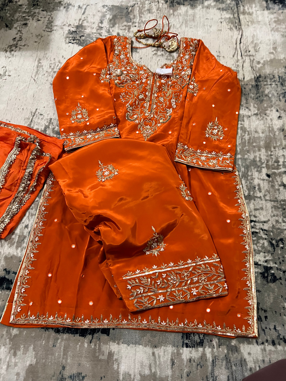 Introducing the Rust Handwork Suit Code 042R from Mannat Boutique, crafted with impeccable artistry. This ensemble features a crape fabric heavy handwork salwar/farshi suit, paired with a luxurious pure chinon dupatta adorned with exquisite golden lace. The fully stitched suit ensures a perfect fit with its meticulous lining, piping, zipper, and elegant latkan details. Ideal for making a statement at any event, this outfit exemplifies the finest of Indian craftsmanship. Elevate your wardrobe with this timeless piece from Mannat Boutique.
