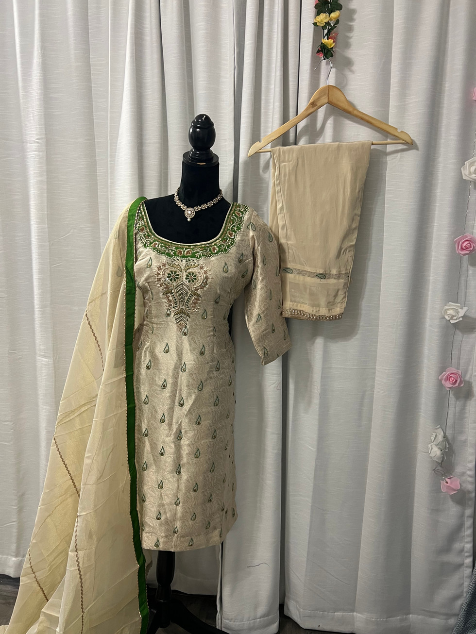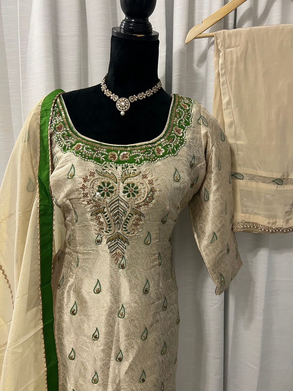 Experience the luxury and elegance of the Shimmer Handwork Suit Code 40S at Mannat Boutique. This exquisite ensemble features a shimmer fabric handwork pant palazzo suit with detailed back shirt work. The duppatta is crafted from shimmer fabric and adorned with beautiful lace, elevating its grace. Meticulously designed, this fully stitched suit comes with lining, piping, a zipper, and latkan for a perfect fit. Embrace the finest Indian craftsmanship with this sophisticated attire, ideal for any special occasion.