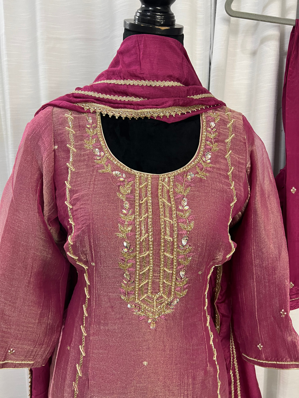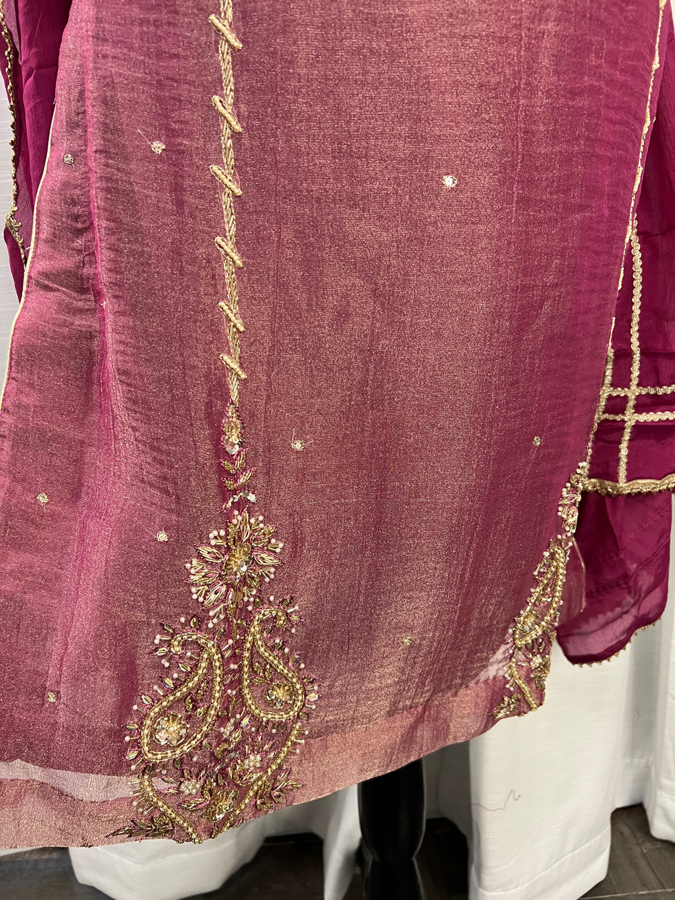 Discover elegance with the Shimmer handwork Suit Code 42 at Mannat Boutique, crafted from luxurious crape fabric featuring intricate shimmer shirt handwork and a matching handwork salwar. This fully stitched ensemble includes lining, precise piping, a convenient zipper, and a delicate latkan at the back for a perfect fit. Complemented by a pure chinon dupatta adorned with lace, this suit embodies refined craftsmanship and timeless style. Designed to meet the highest standards, it reflects Mannat Boutique’s commitment to quality and authentic Indian outfits. Ideal for those seeking sophistication and comfort in one complete package.