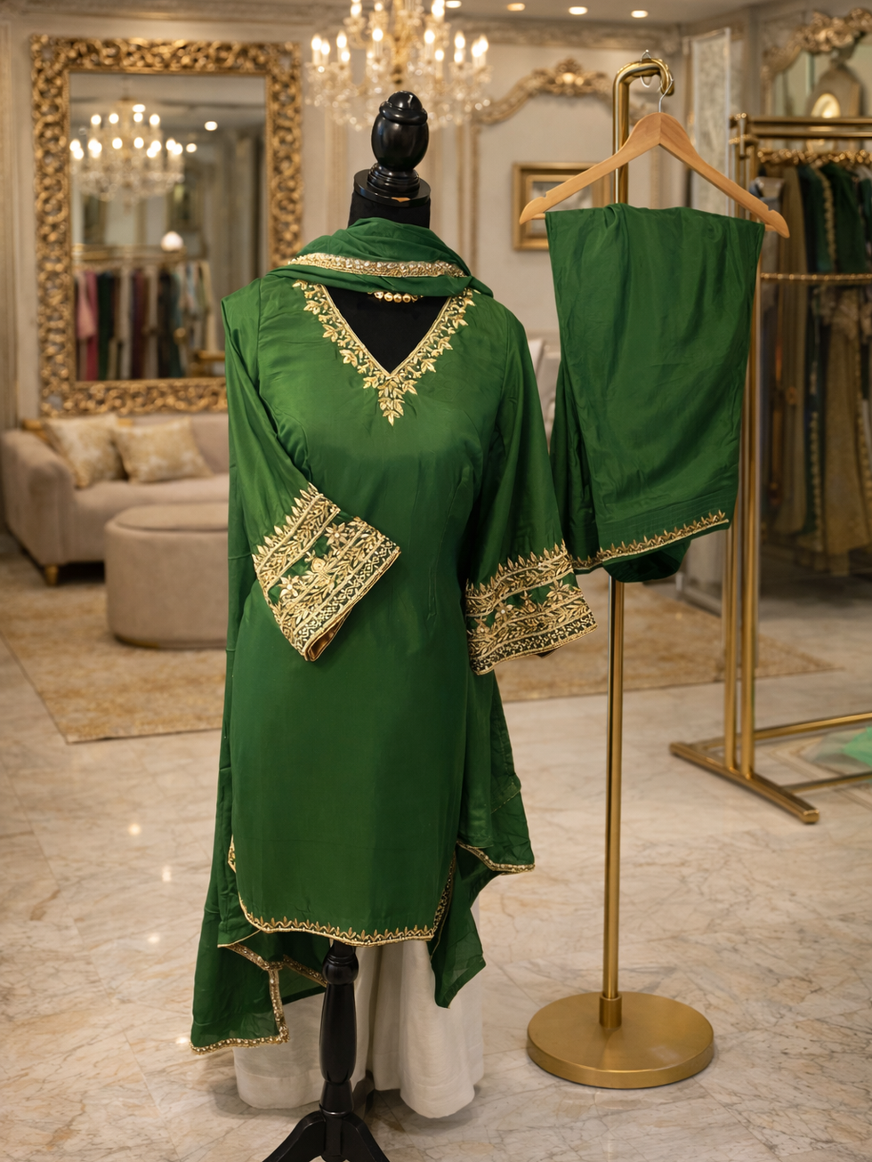 Experience elegance with the Silk Handwork Suit Code 42S from Mannat Boutique, crafted on premium silk fabric featuring exquisite handwork on both front and back farshi salwar suit. This fully stitched design includes lining, piping, a zipper, and a charming latkan at the back for added sophistication. Complemented by a pure chinon dupatta adorned with delicate lace, this ensemble perfectly blends traditional artistry with modern tailoring. At Mannat Boutique, we pride ourselves on delivering meticulously crafted Indian outfits that celebrate timeless style and quality. Elevate your wardrobe with this luxurious suit that embodies grace and comfort.