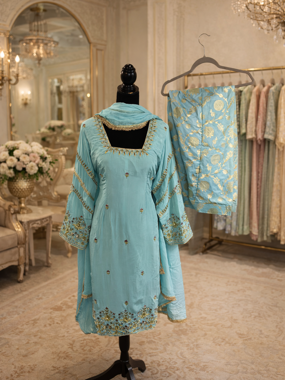 Experience elegance with the Sky Blue Handwork Sanwar Suit Code 48, available at Mannat Boutique. This exquisite ensemble features a crape fabric shirt adorned with intricate handwork, paired flawlessly with a rich Banarsi silk salwar suit. Complementing the outfit is a pure chinon dupatta with delicate lining, enhancing its graceful appeal. The fully stitched suit includes thoughtful details such as lining, piping, a zipper, and a latkan at the back, ensuring both comfort and style. Designed to meet Mannat Boutique’s commitment to quality and tradition, this suit is perfect for those seeking refined Indian attire online.