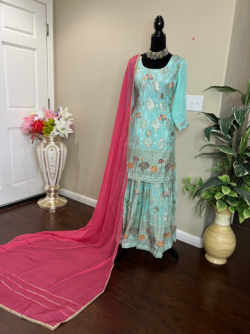 Discover elegance with Sky Blue Sharara Suit Code 044SB from Mannat Boutique's exquisite Indian outfits collection. Crafted from premium crape fabric, this suit features stunning heavy handwork that exudes sophistication. The ensemble includes a fully stitched suit with lining, pipin, and a convenient zipper added for your comfort. Paired with a graceful Palin dupatta adorned with golden lace, this sharara suit is designed to make you shine at any occasion. Experience the perfect blend of traditional craftsmanship and modern style with this captivating piece.