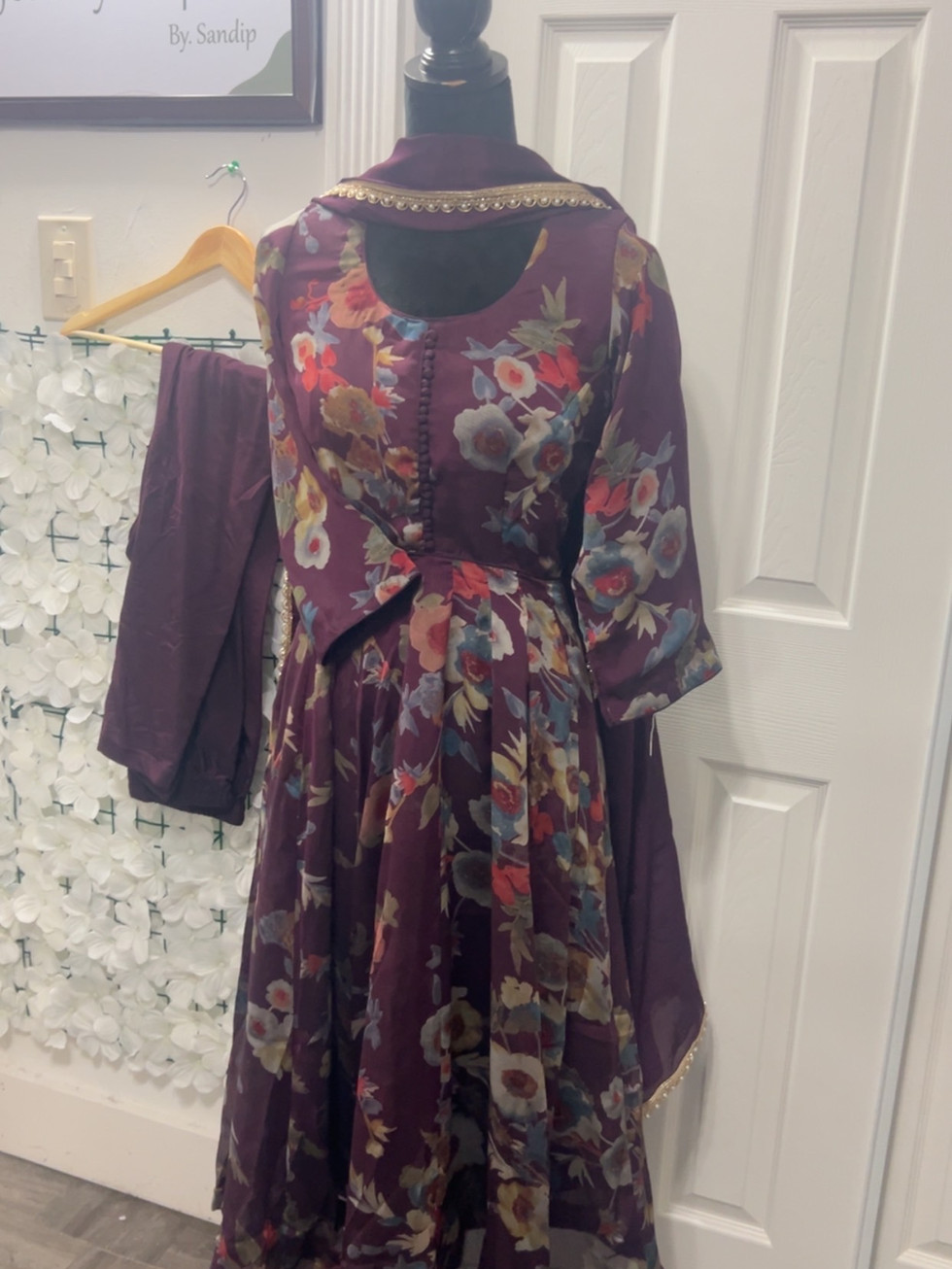 Discover the timeless elegance of the Wine Anarkali Suit, exclusively at Mannat Boutique. Crafted from pure georgette fabric, this fully stitched Anarkali features a luxurious lining and is paired beautifully with a comfortable Lacra pajami. The ensemble is completed with a pure chinon dupatta adorned with exquisite lace, offering grace and sophistication. Perfect for any special occasion, this outfit exemplifies our commitment to quality and style. Elevate your wardrobe today with this meticulously designed piece, tailored to enhance your natural beauty.